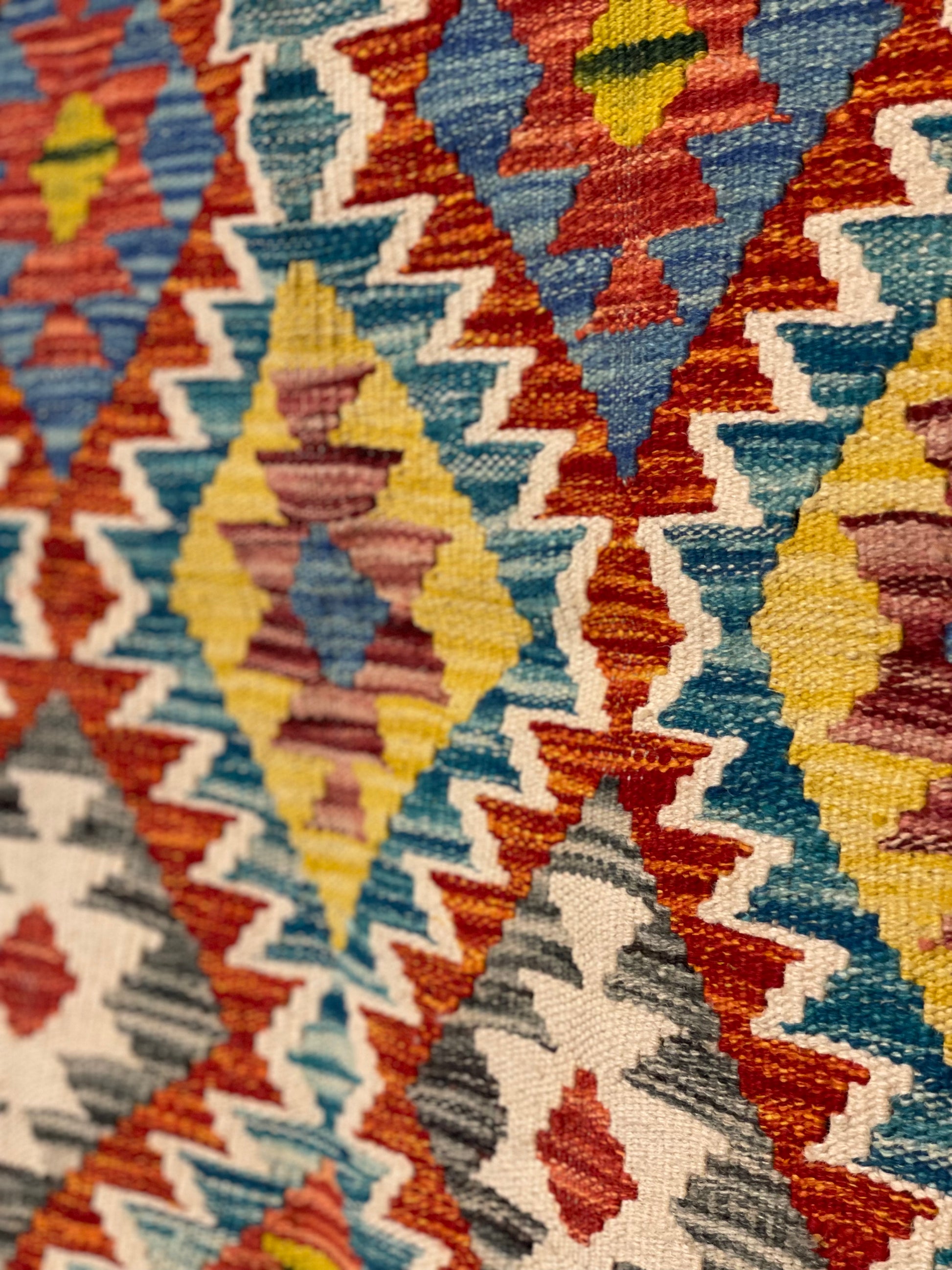 This Kilim boasts an dazzling range of colours. Hues of fiery red and flaming orange dance along the monsters foot motifs on the border, and are also present in several of the stepped polygons. Although this intense heat has the potential to overwhelm the rug, splashes of aqua blue in the main field help provide a cool and refreshing relief. Overall, these bold visual choices align well with many tastes.
