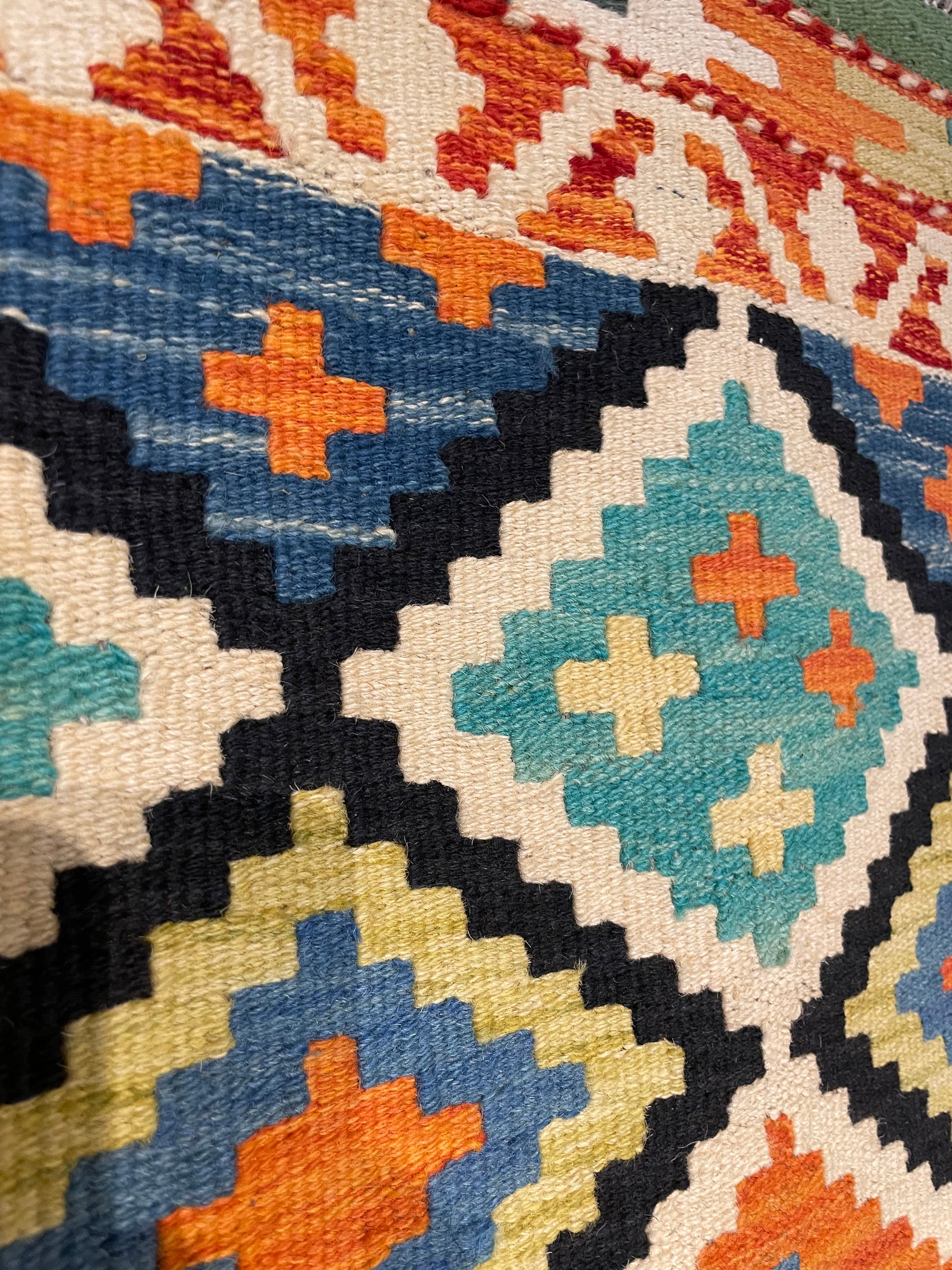 This sleek runner is has orderly and appealing design. A meandering border sits on the striated ground, that shows variations of orange and light red, whilst the field uses a colour palette that is based around turquoise and mint green. With the inclusion of various crosses and stars across the diamond lattice, this rug effectively bring traditional motifs into a modern setting.