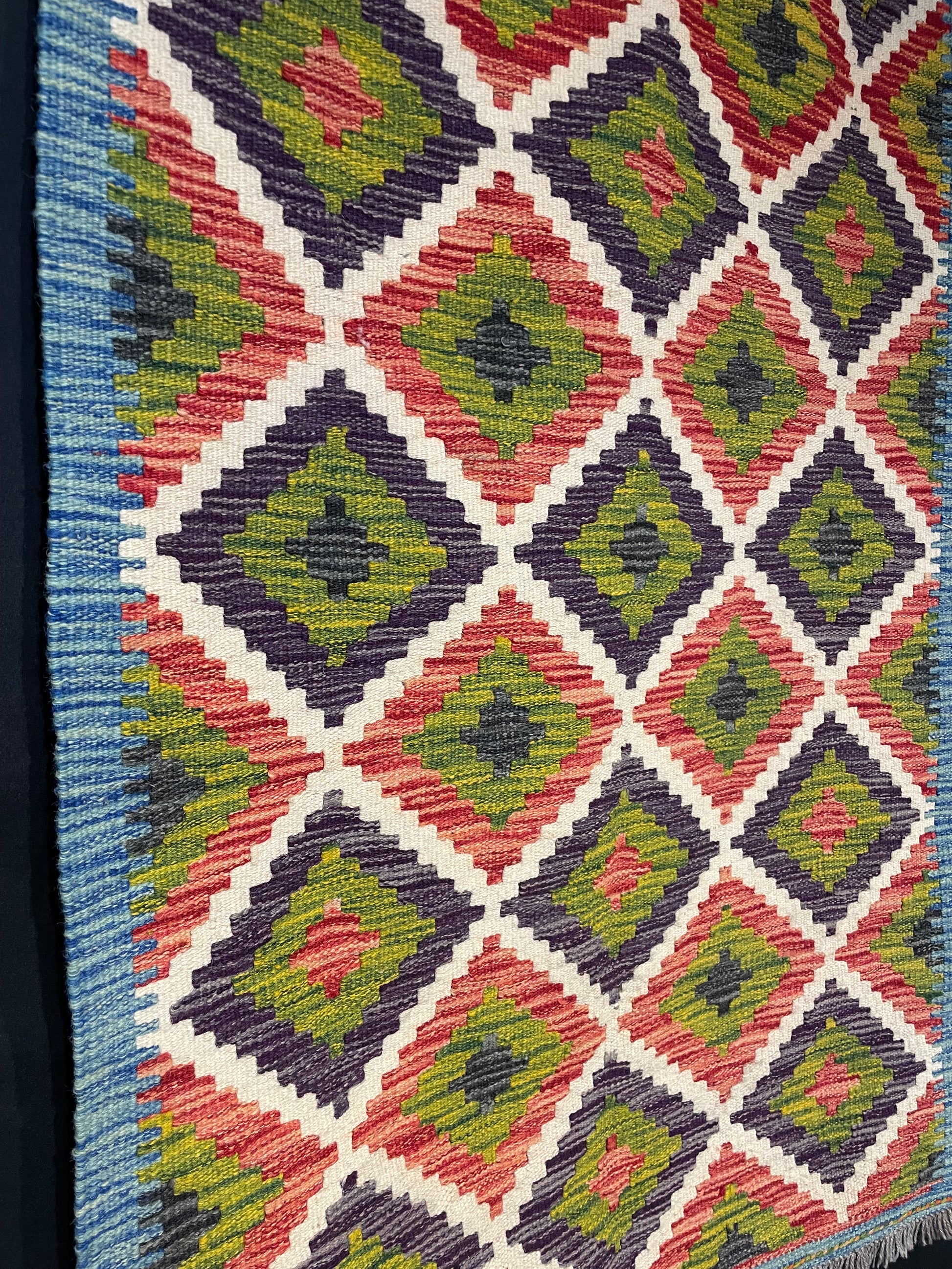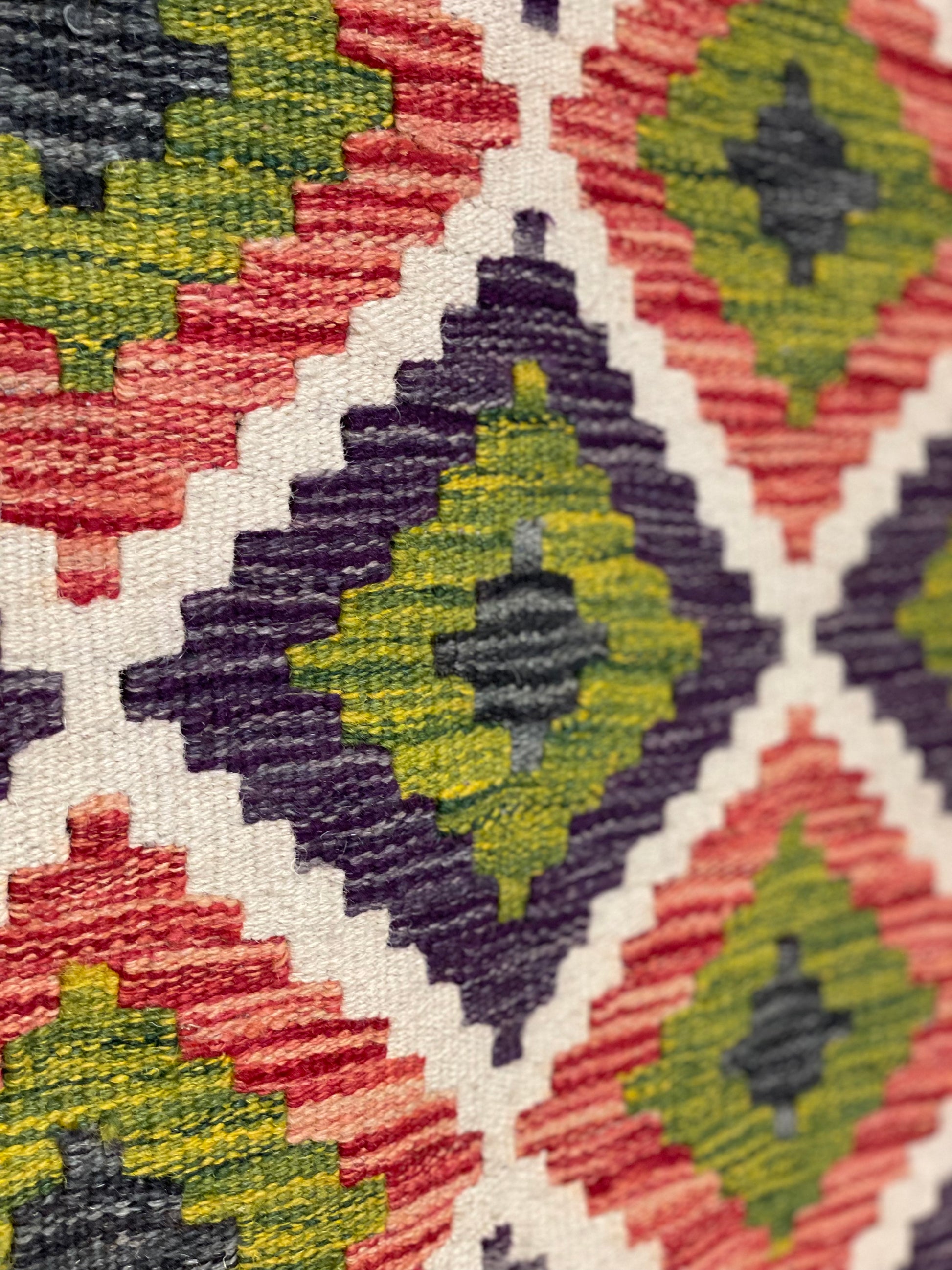 This Kilim, arranged in a geometric diamond lattice, boasts an enticing colour palette. For example, the craftsman uses shades of strawberry red alongside lime green within the majority of diamonds, creating a clever blend of sweet and sour. It is also worth noting the whites and purples, which act as more neutral combination to add some visual balance. Overall, this vibrancy and array of flavours within this rug make it perfect way to invigorate your modern decor.