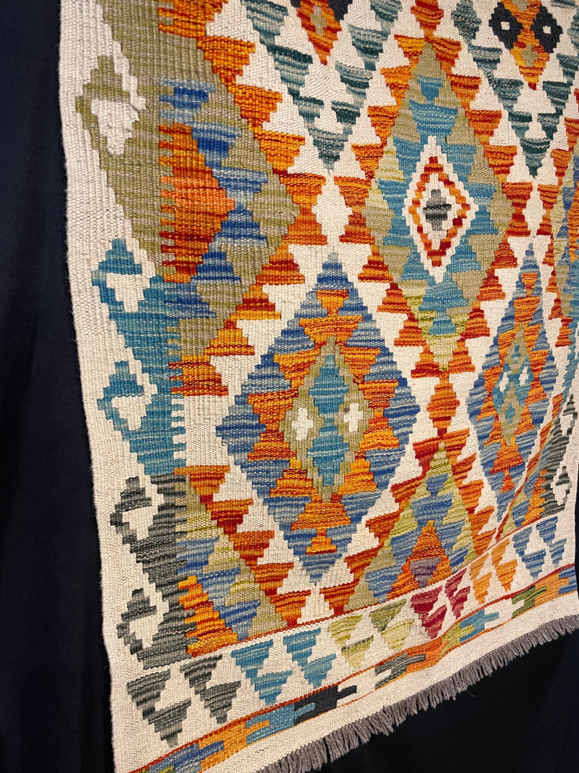 The creator of the Kilim had a great sense of spacial awareness. The wavy curls of the monsters foot motif along the border are clearly rendered and have generous spacing between them. This is also true for the central area - it would be easy to feel overcrowded with the variations of diamond medallions and polygons, and yet it maintains a smart look. Overall, the size and design of this Kilim gives it a versatility to fit in multiple spaces.