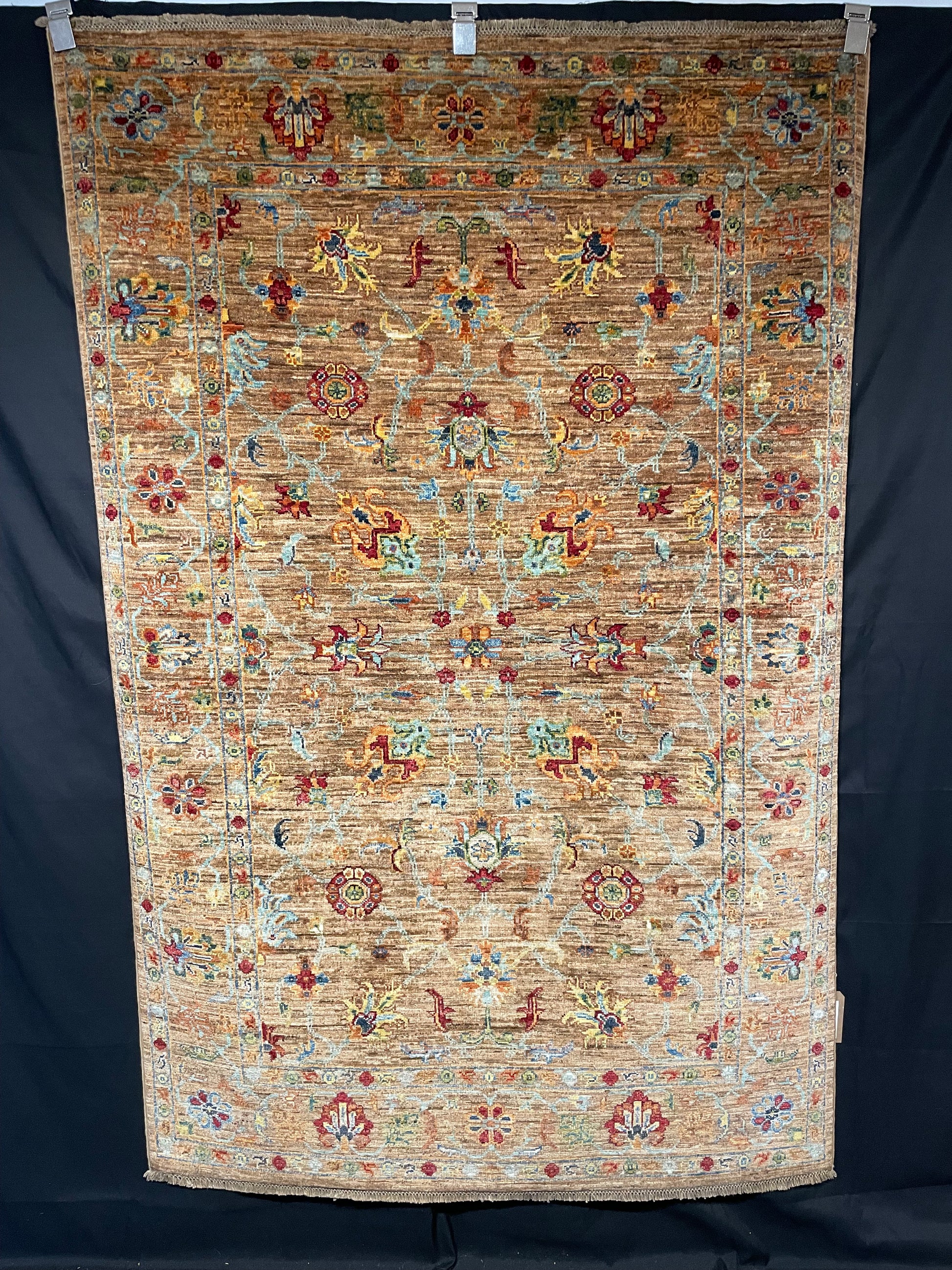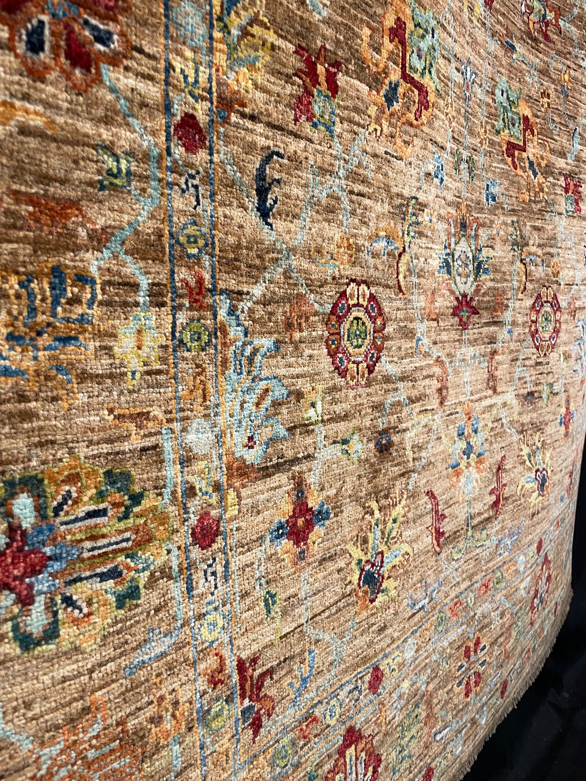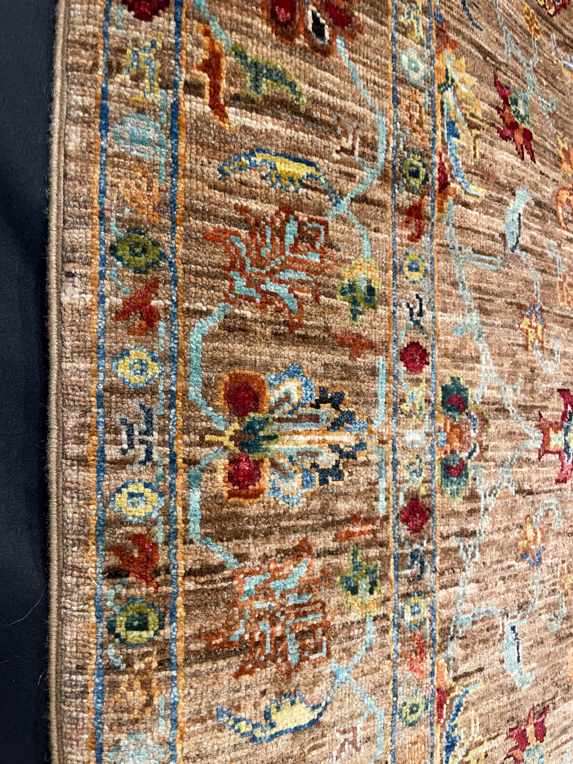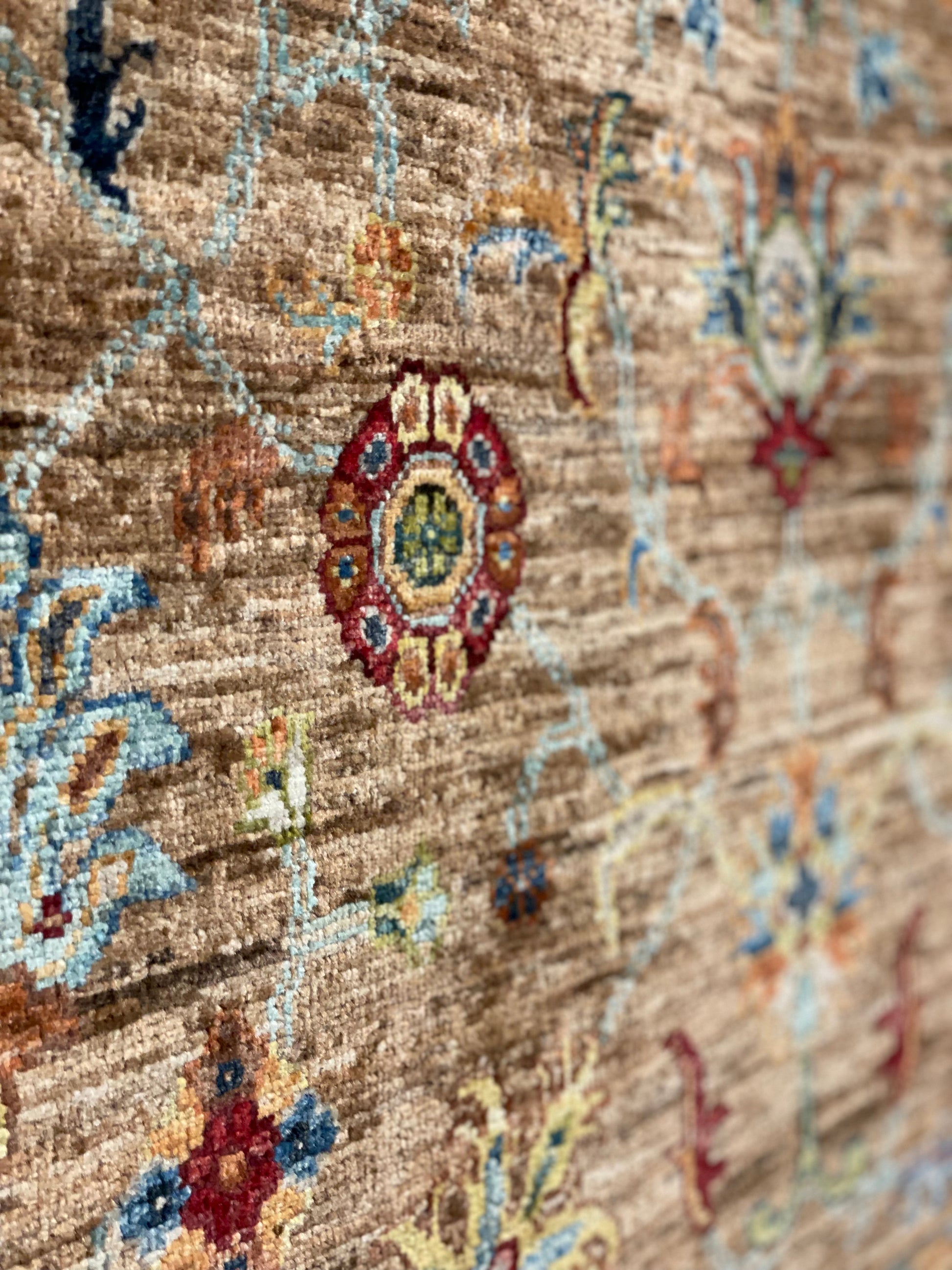 This Sultani rug is embedded with a subtle elegance. Softly-drawn plants and flowers, which blossom between the border and field, are coloured in hues of cherry red and warm orange. This is complemented by pops of mint green on the stems, which effectively add a layer of natural vibrancy to the earthy ground. Although this design lacks the rigidity of a structured composition, its creative freedom is perhaps a better reflection of the beauty found in the natural world.