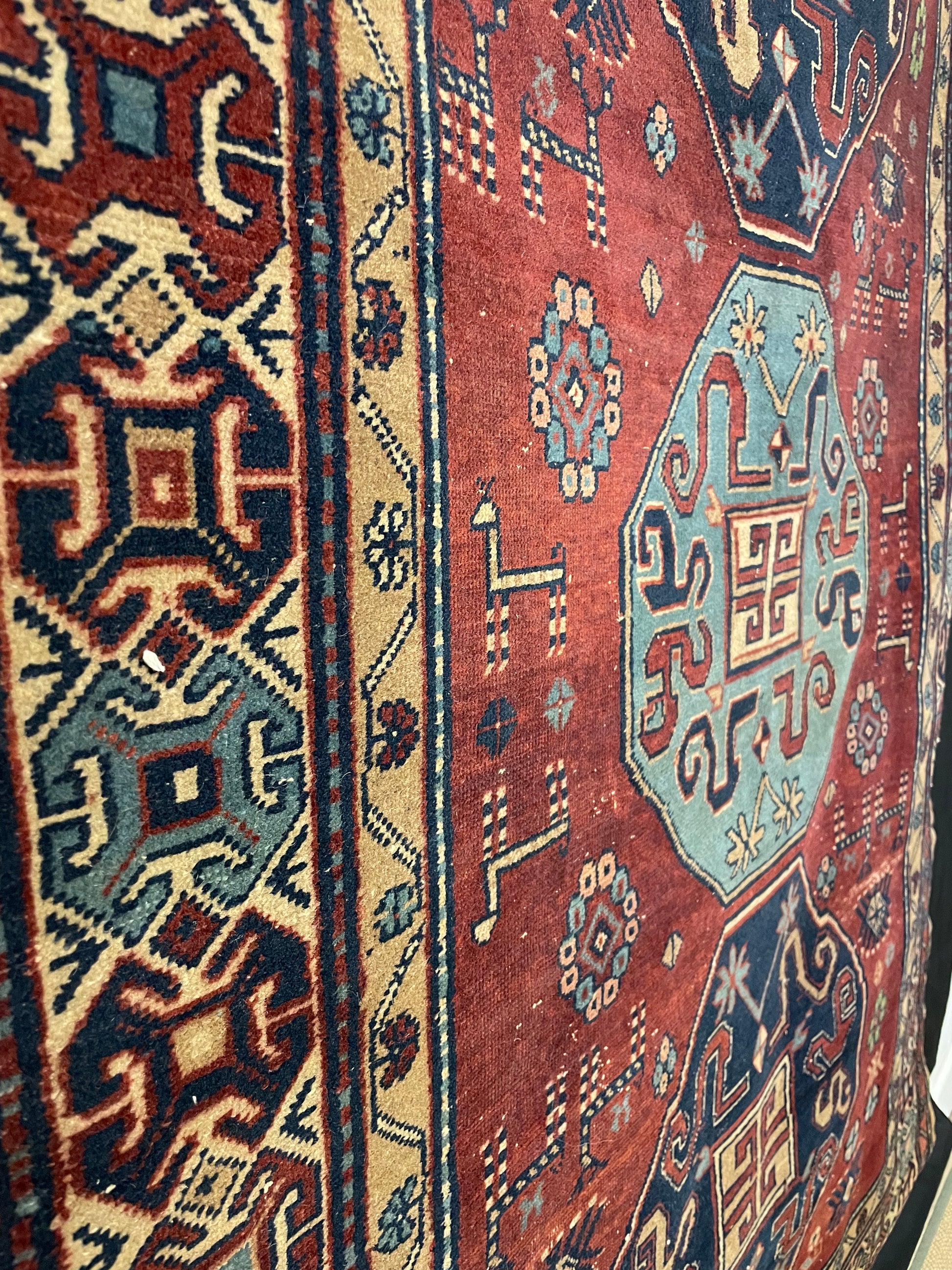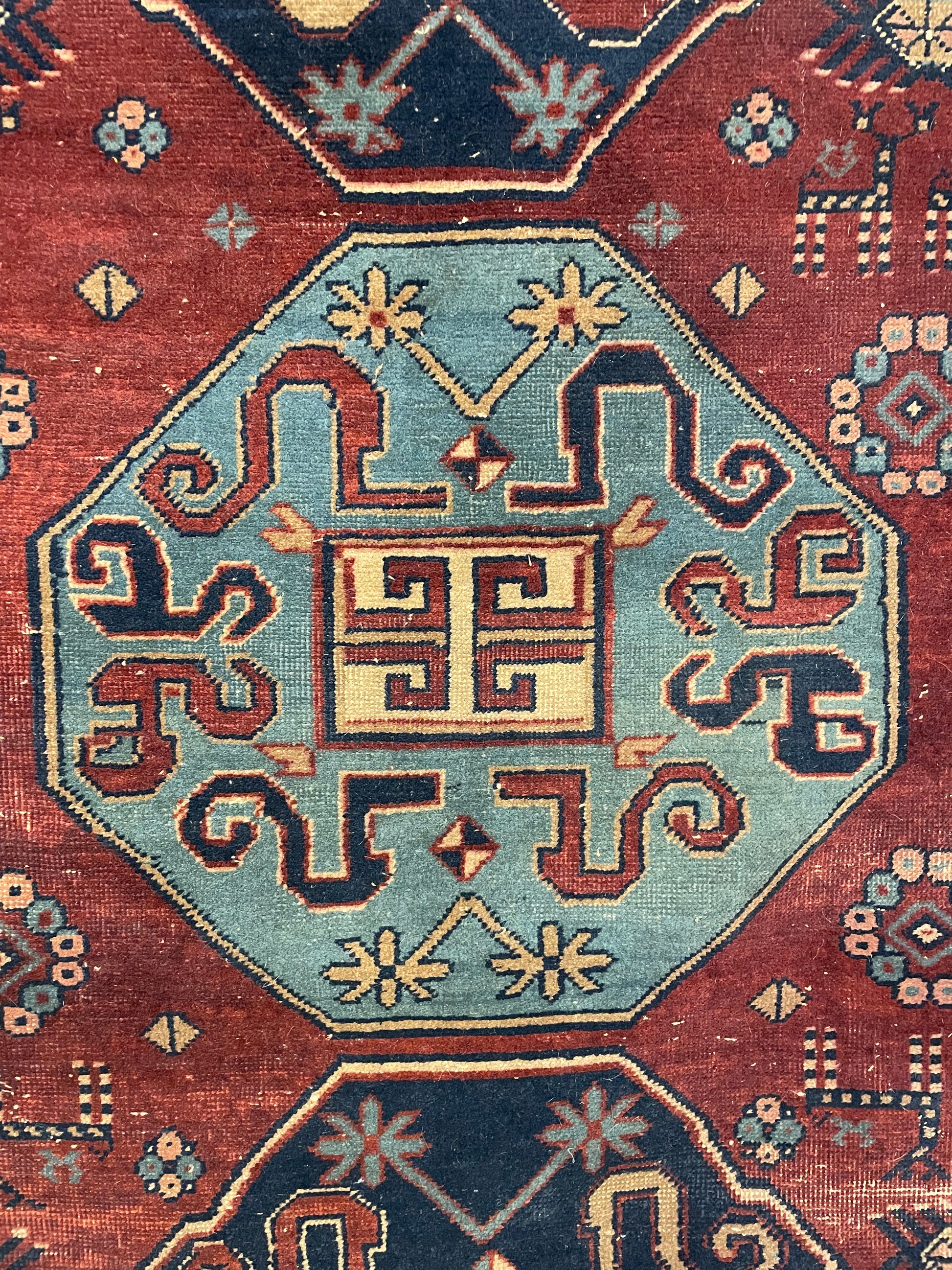 Bold colours and tribal imagery are intertwined throughout this Antique Erivan. Familiar latched-hook squares dominate the border, whilst the intricate running water motif flows well along the sandy ground. As the scene transition onto the main field, hand-drawn horses, deer and flower heads flourish around the 'cloud band' design of the three polygons, with the middle one adorned in a striking skylight blue. Despite being a bold colour choice, the central placement of the medallion helps the rug retain its balance and symmetry.