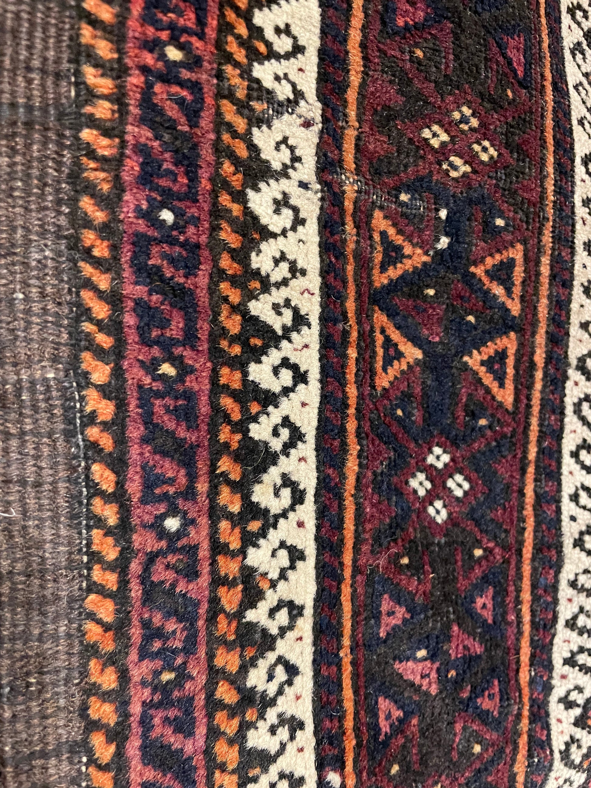 This Baluch sub tribe rug contains some excellent intricacies. At first, the most dominant colour appears to be an earthy brown, but as you look closely, shades of light orange and burgundy become prevalent. This is particularly noticeable across the rectangular-shaped motifs, as well as the smaller pictograms that fill the inky blue background. Although the central field displays some uniformity, the main border is abundant with a collection of unique patterns, a clear deviation to other Baluch pieces. Therefore, it is the balance of order and spontaneity that makes this rug interesting.