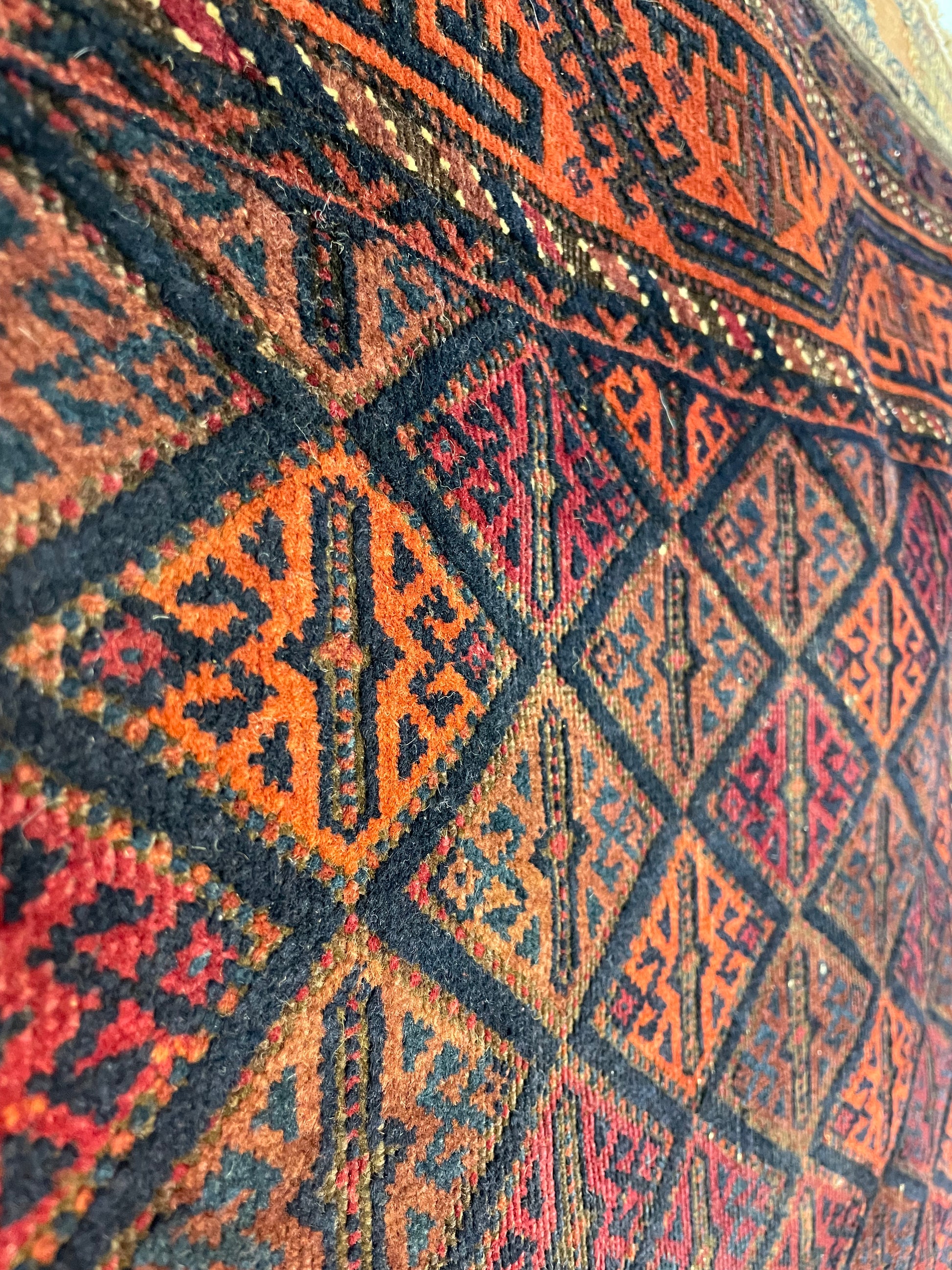 This Khorasan Baluch captivates through its unique design. It features an eye-catching wavy border, that weaves its way around the rug like a snake. This movement is further intensified by the vivid orange hue that makes up the ground. In the centre, the field unfolds with a lattice of small diamonds glowing with deep, fiery tones, helping to draw the eye fluidly across the surface rather than to a single focal point. As a result, it creates a masterful balance for those seeking rich Baluch colours with more expressive patterning.