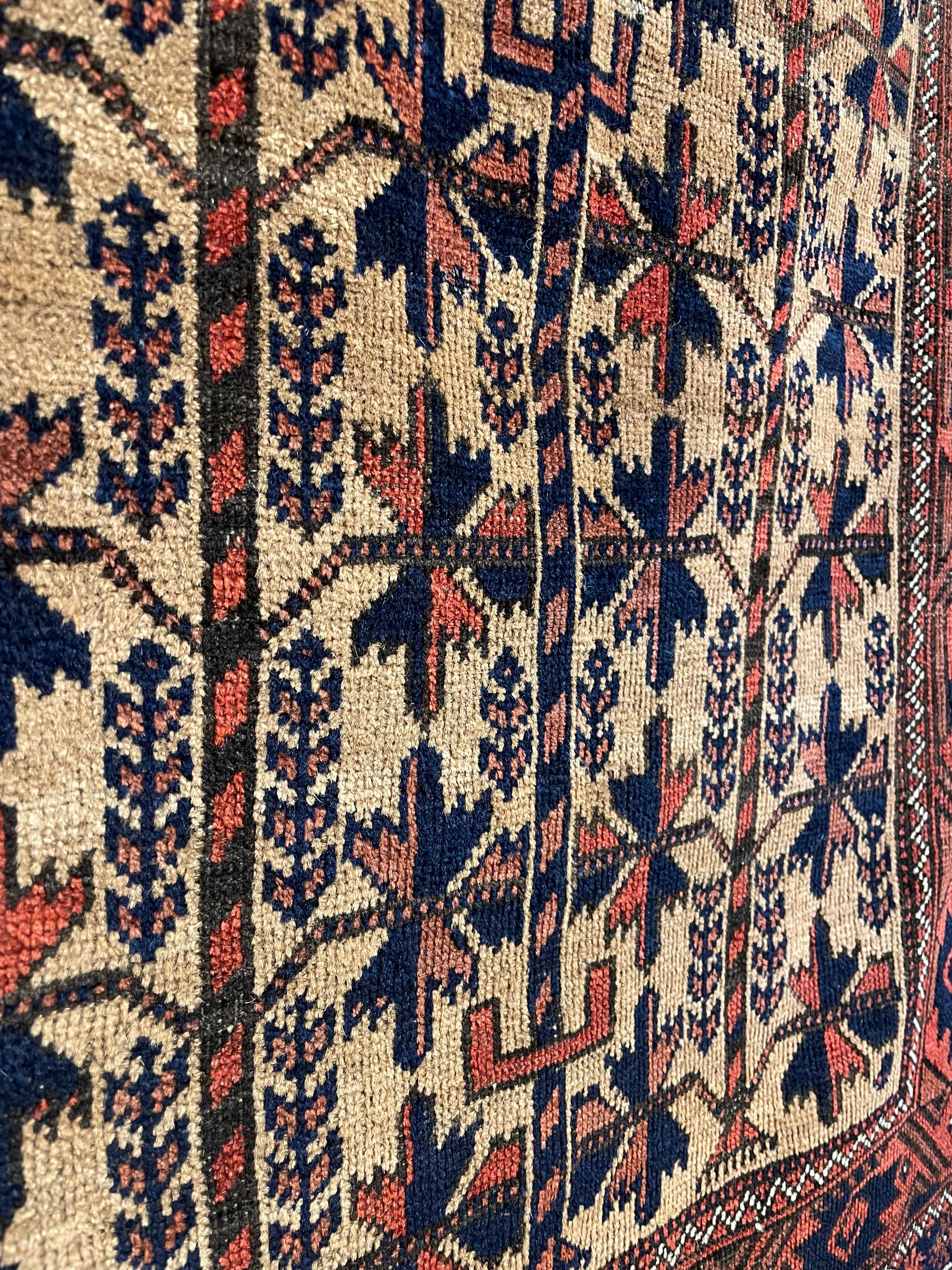 This unusual Baluch rug displays some striking features. For example, there is no central mihrab, or prayer niche, but two upraised hands (hands of fatima). The camel ground across this field is also desirable to find on such pieces, giving it a luminous quality that leaves the onlooker transfixed on the butterfly shaped motifs. The finishing border pattern gives us a glimpse of the tribal origins of this piece, in a rug that showcases an artistic blend of tradition and ingenuity.