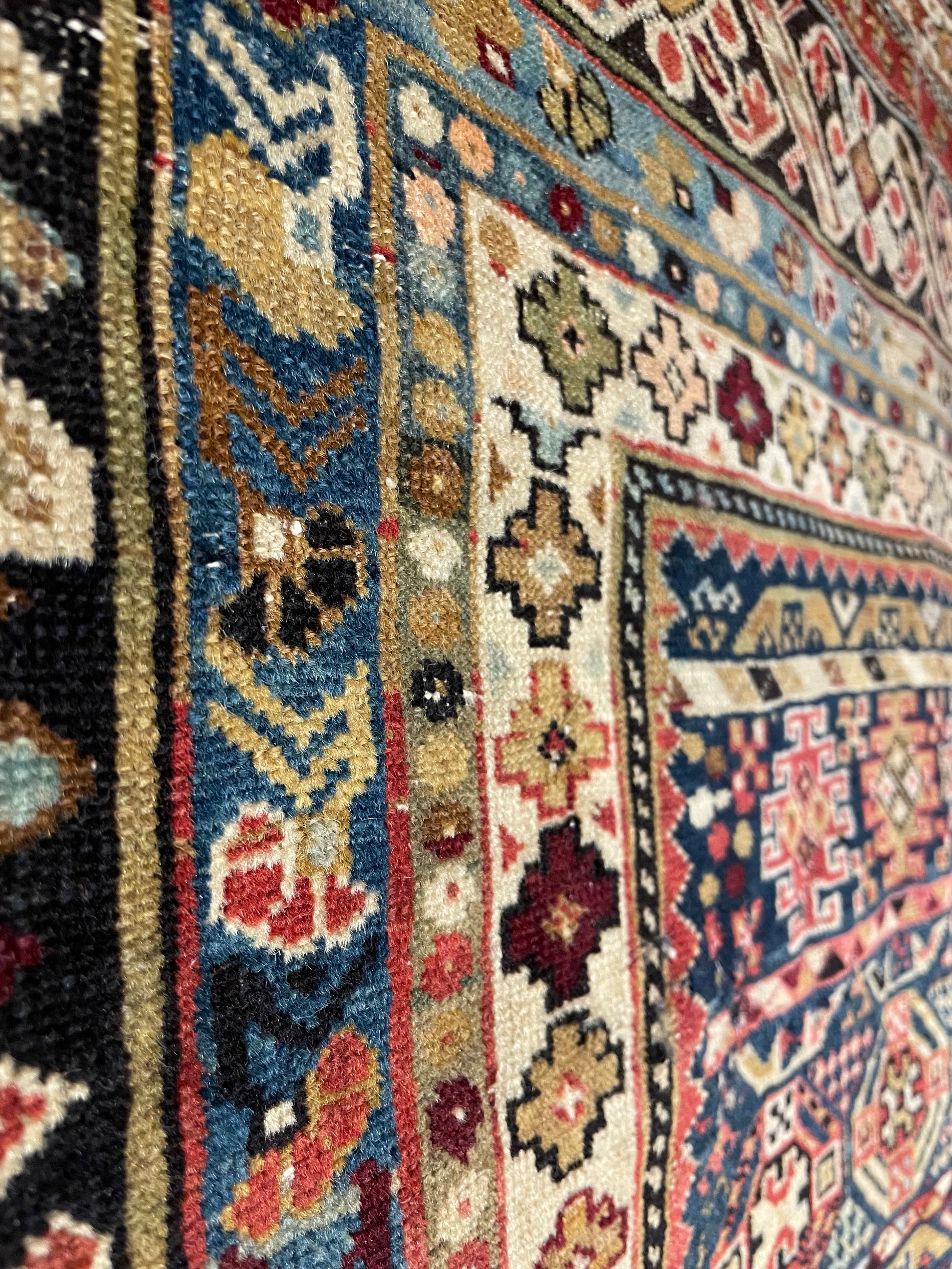 This charming caucasian chichi overflows with character. The borders display a range of emotive imagery, from softly coloured stars and flower heads to more incisive spikes and diagonal bars. Although this results in a highly condensed central field, the motifs here are just as striking, with rows of crosses and polygons shining on the midnight blue ground. Overall, this thoughtfully-arranged rug is packed sensory stimulation, which allows for a new perspective every time you admire it.