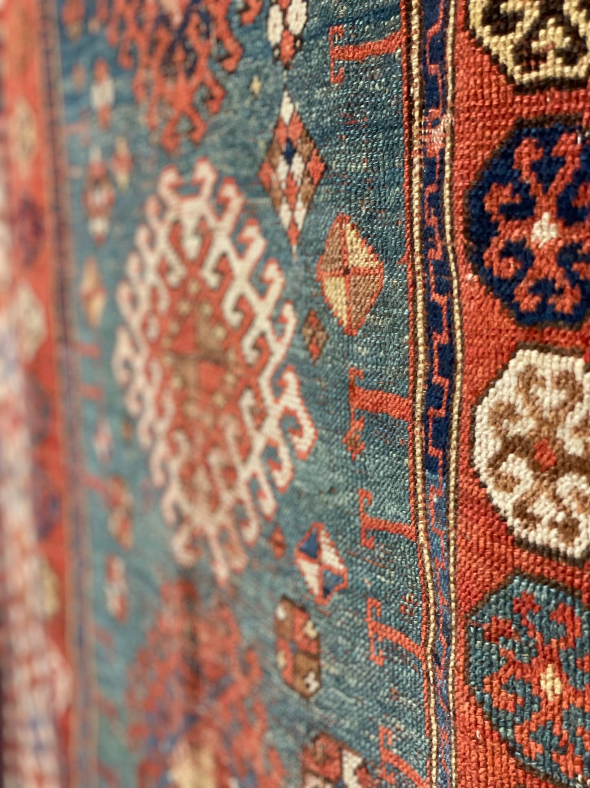 This 19th Century rug layers colour and imagery to another level. The ivory ground border allows the eight-pointed stars to shine, whilst the pastel hues on the hooked octagons work well to frame the central mihrab. The prayer niche acts as the centrepiece of the rug, with an enchanting green/blue that shows a beautiful level of abrash as you move up the panels, an unusual and desirable feature.