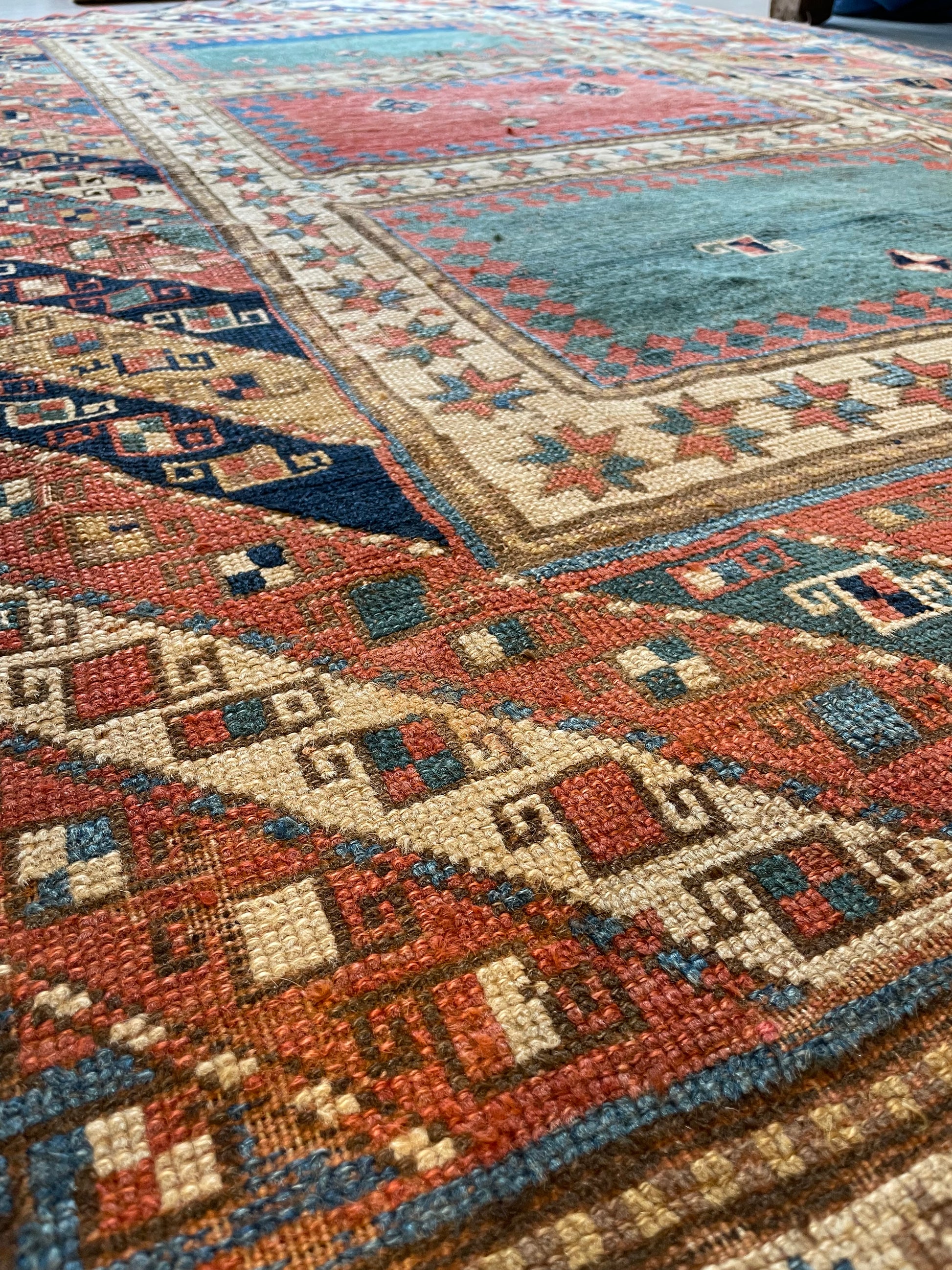 This colourful South Caucasus rug features some unusual combination design hybrid elements. The main border is formed by rows of diagonal bars typical of Gendje & shahsavan rugs, each enclosing latch-hook squares, while the field is divided by an ivory star framework. This structure creates three rectangular panels: two rendered in a soft green and a central panel in deep madder red. The result is an eye-catching composition that balances minimalism with dynamic patterning, creating a distinctive antique piece that will enrich anyone’s collection.