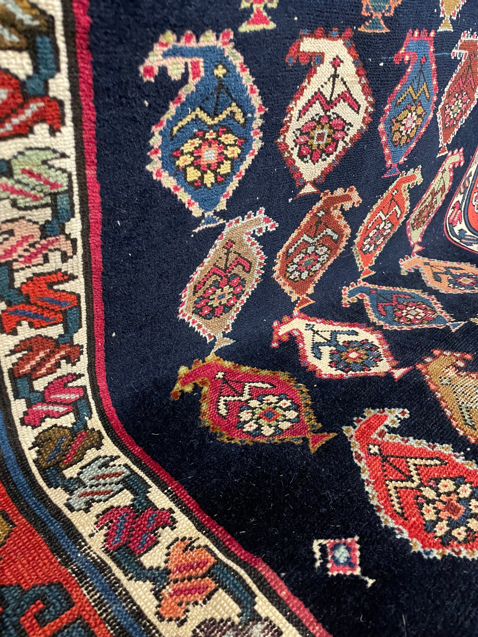 This colourful expressive Karabagh runner is a treasure trove of artistic imagination. The ivory borders are made up of interlocked blossoms, that sway side to side as if being blown by the wind, an effect that is also recreated in the indigo field with the drop-like 'botehs.' This section is really brought to life through the pastel coloured rosettes, and the smaller flower heads that grow in-between, a unique addition by its creator. Overall, the dynamic feel of this rug gives vast energy and a rich glow of colour.