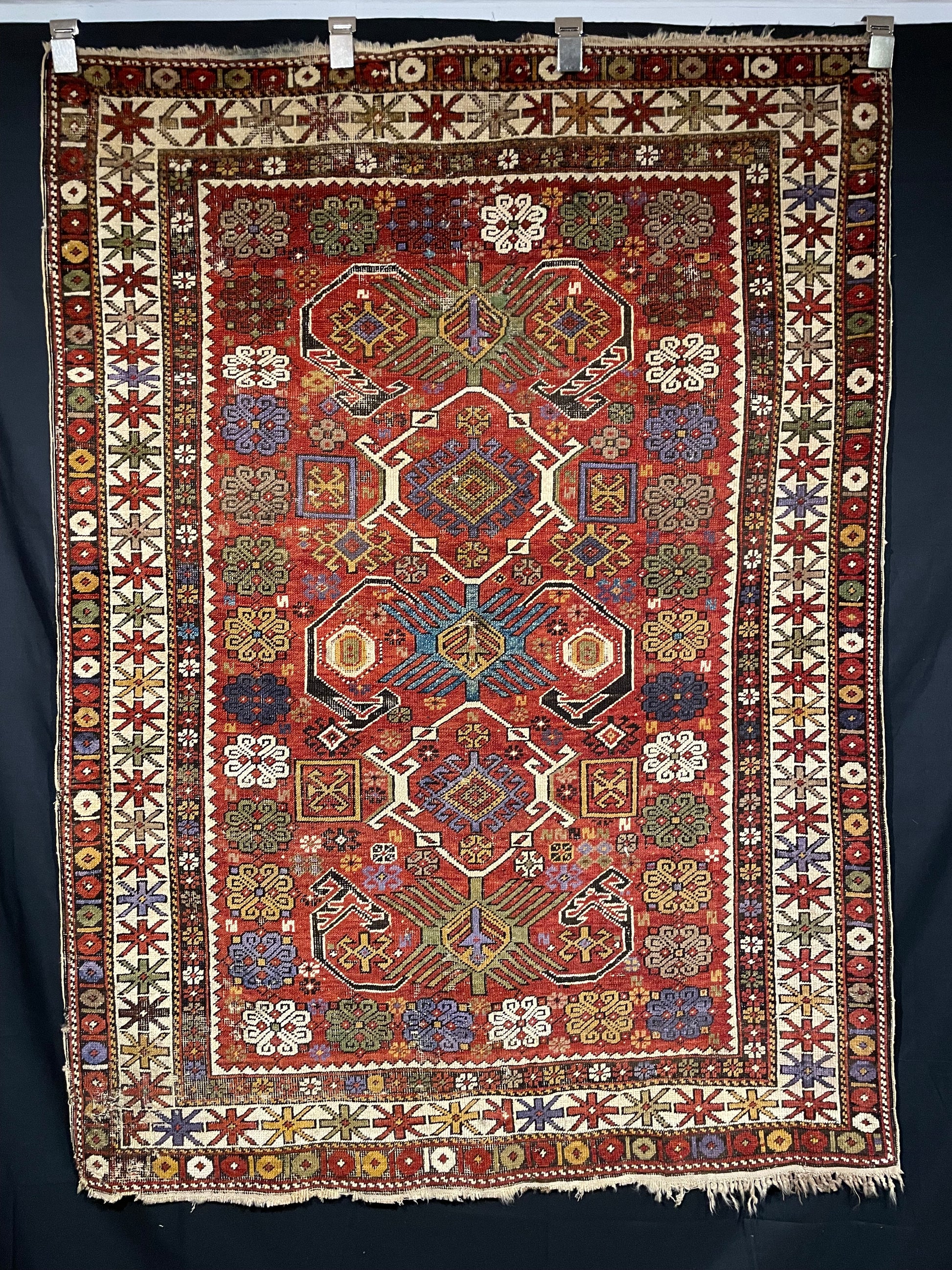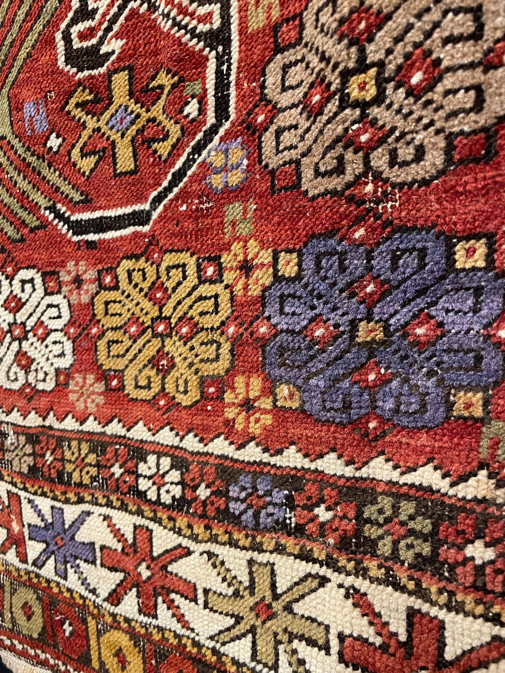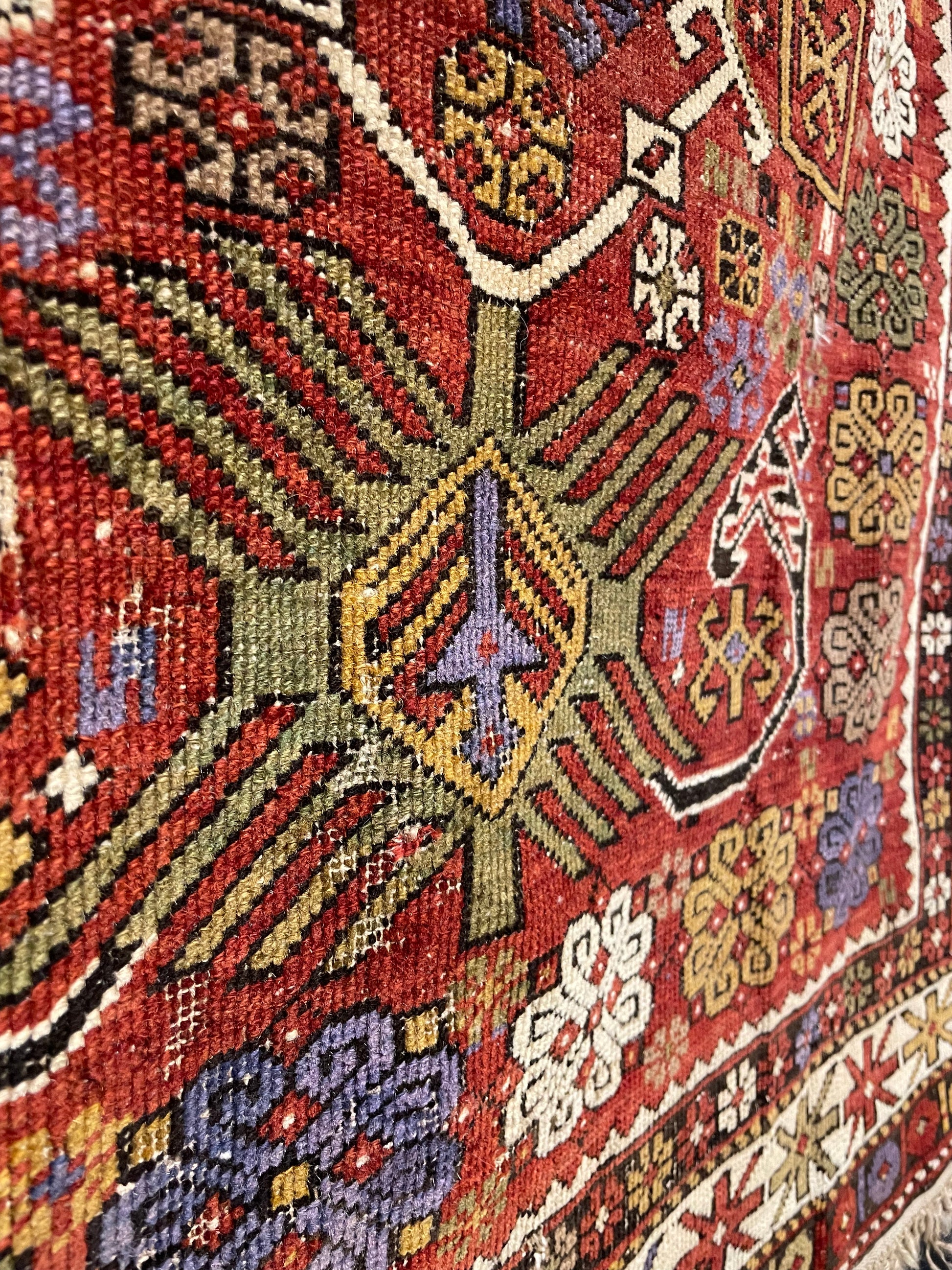 This rug displays an impressive colour pallete, that ranges from bold blues and greens, to muted creams and yellows. The abundance of dynamic motifs like ram horns, striking sunbursts and stylised flowers are distinctive elements found in many Bidjov designs. Completed with a row of star-shaped motifs on the border, this rug maintains a playful and vibrant feel. Nice compact size with desirable colours.