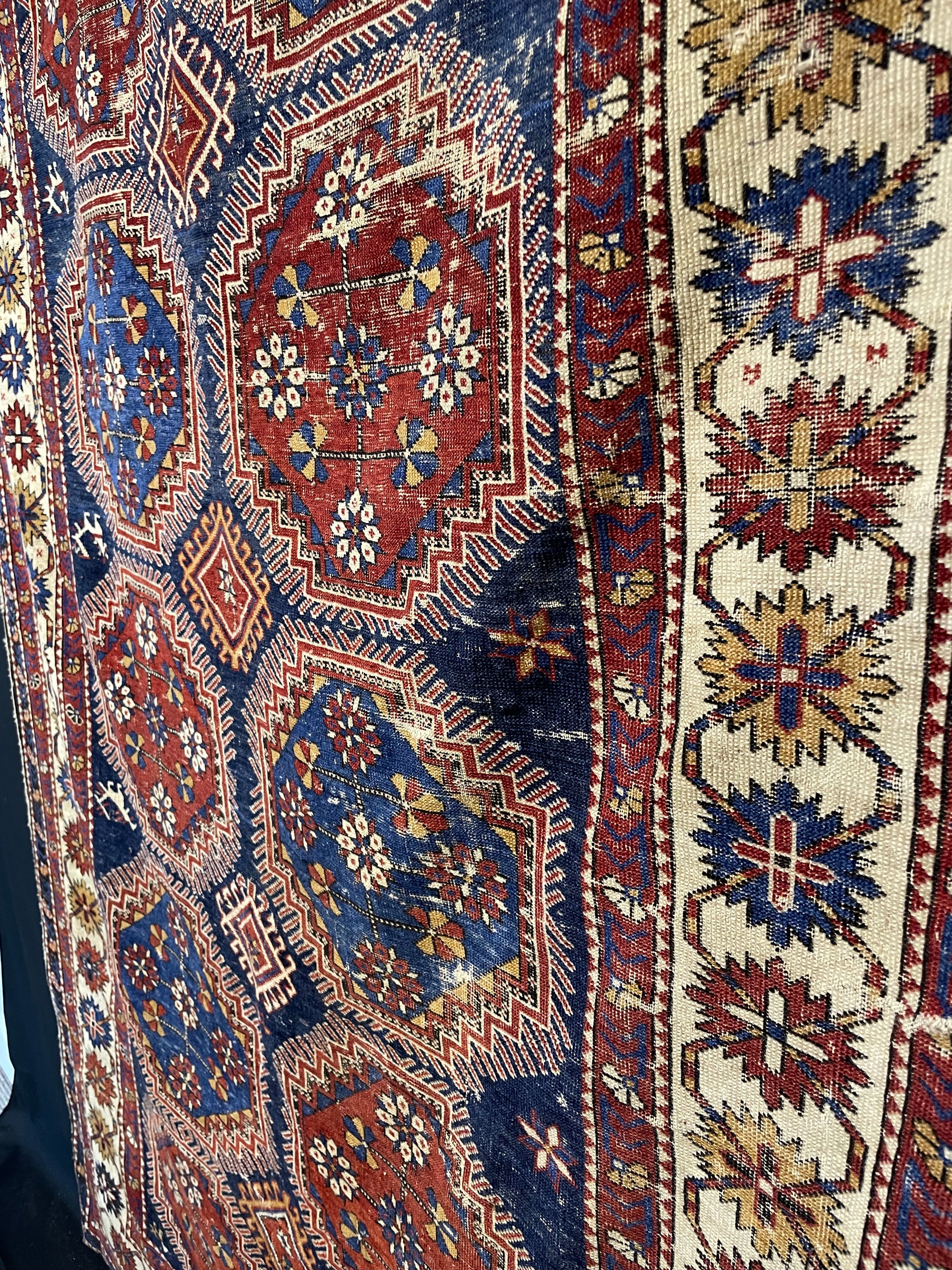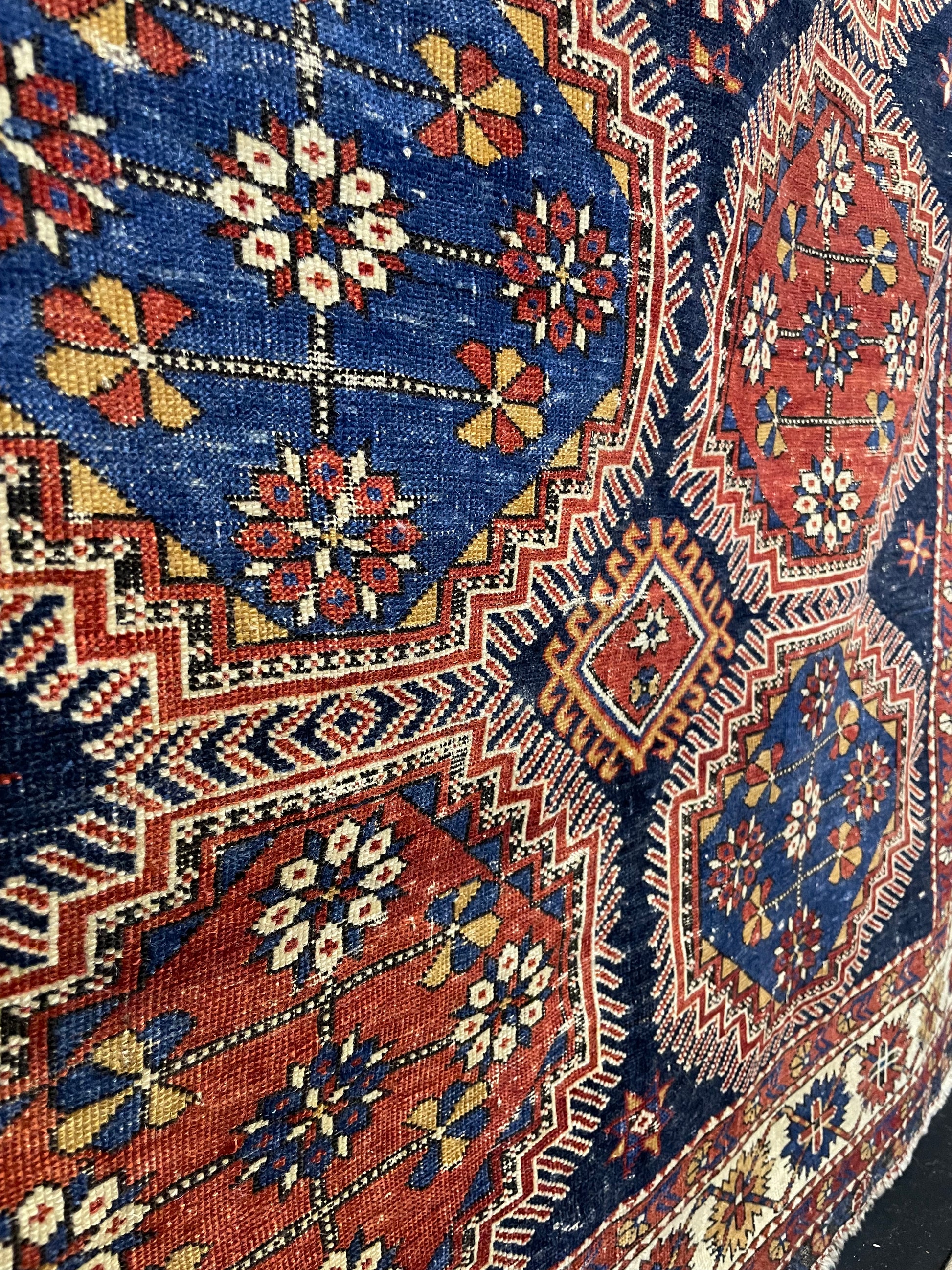 Most Surakhani rugs consist of three central medallions, so the fact that this rug has ten is quite unusual. Decorative flowers adorn the inside of these octagons, whilst a set of latch hooked diamonds ensure the piece maintains a balance and symmetry. Vivid colours really enhance the feel of this lovely piece. The ivory border is the perfect backdrop for the linked crab design. Obvious condition issues but still a desirable standout rug.