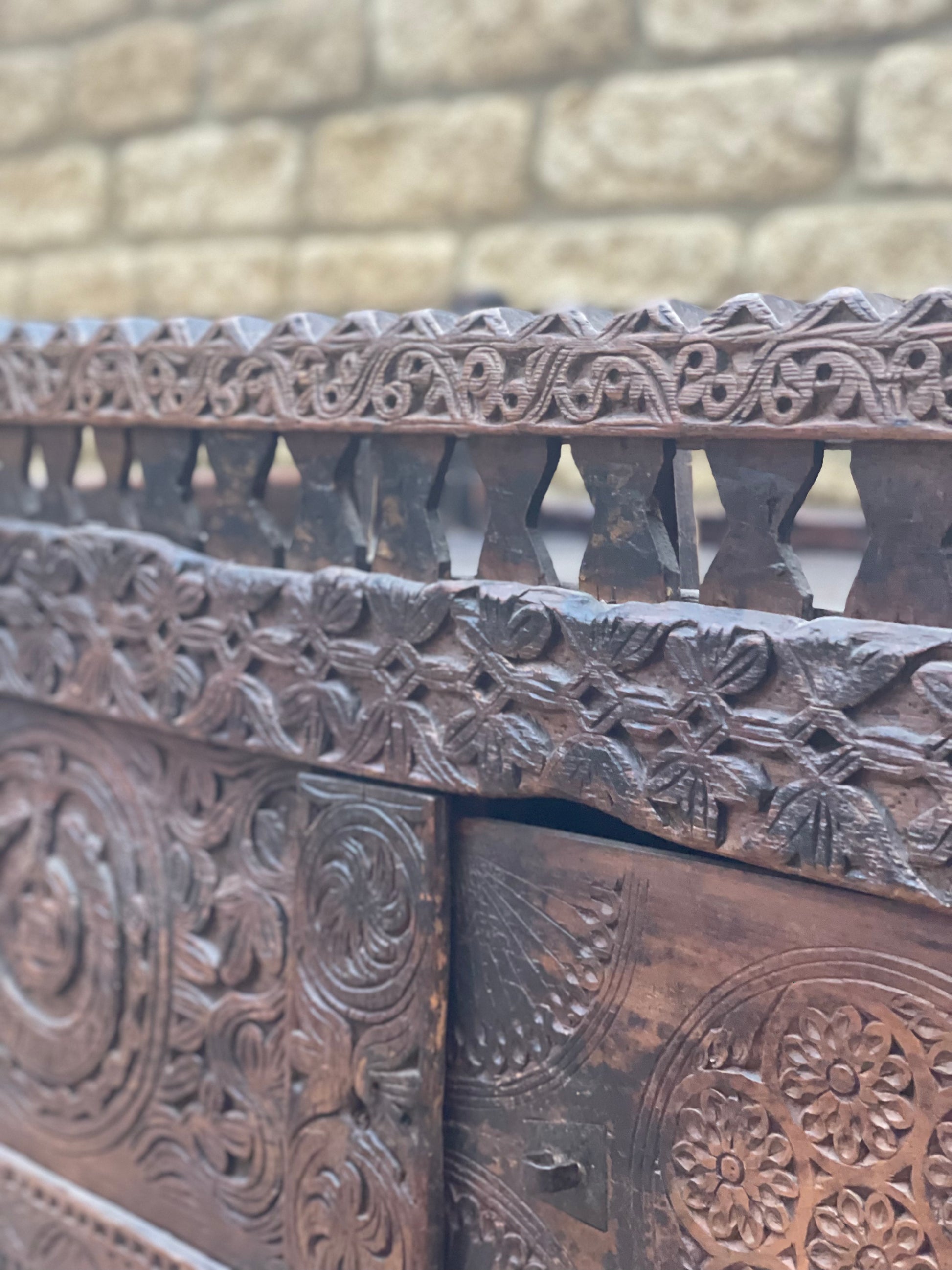 This ornate chest bears all the hallmarks of exceptional craftsmanship. It was carved from Himalayan cedar, a wood favoured by artisans due to its lightweight and durable qualities. This would have made it easier to carve and shape the overall structure.