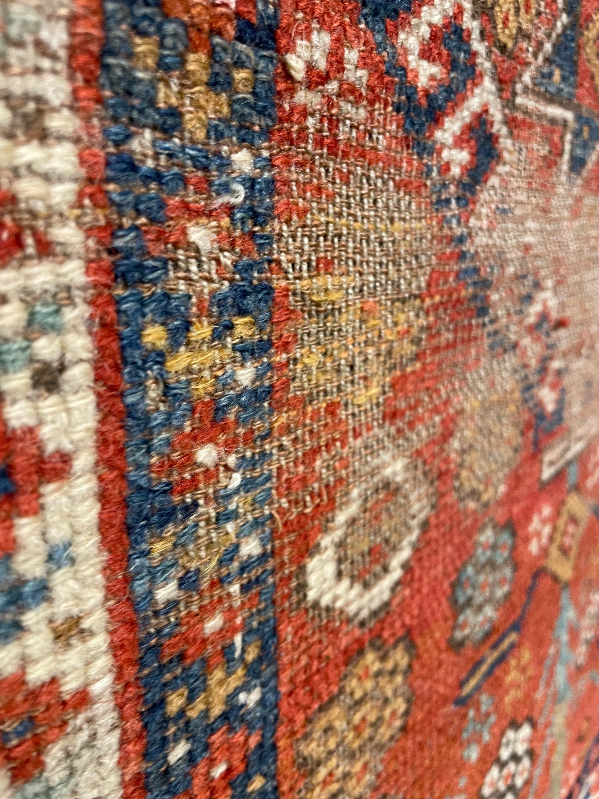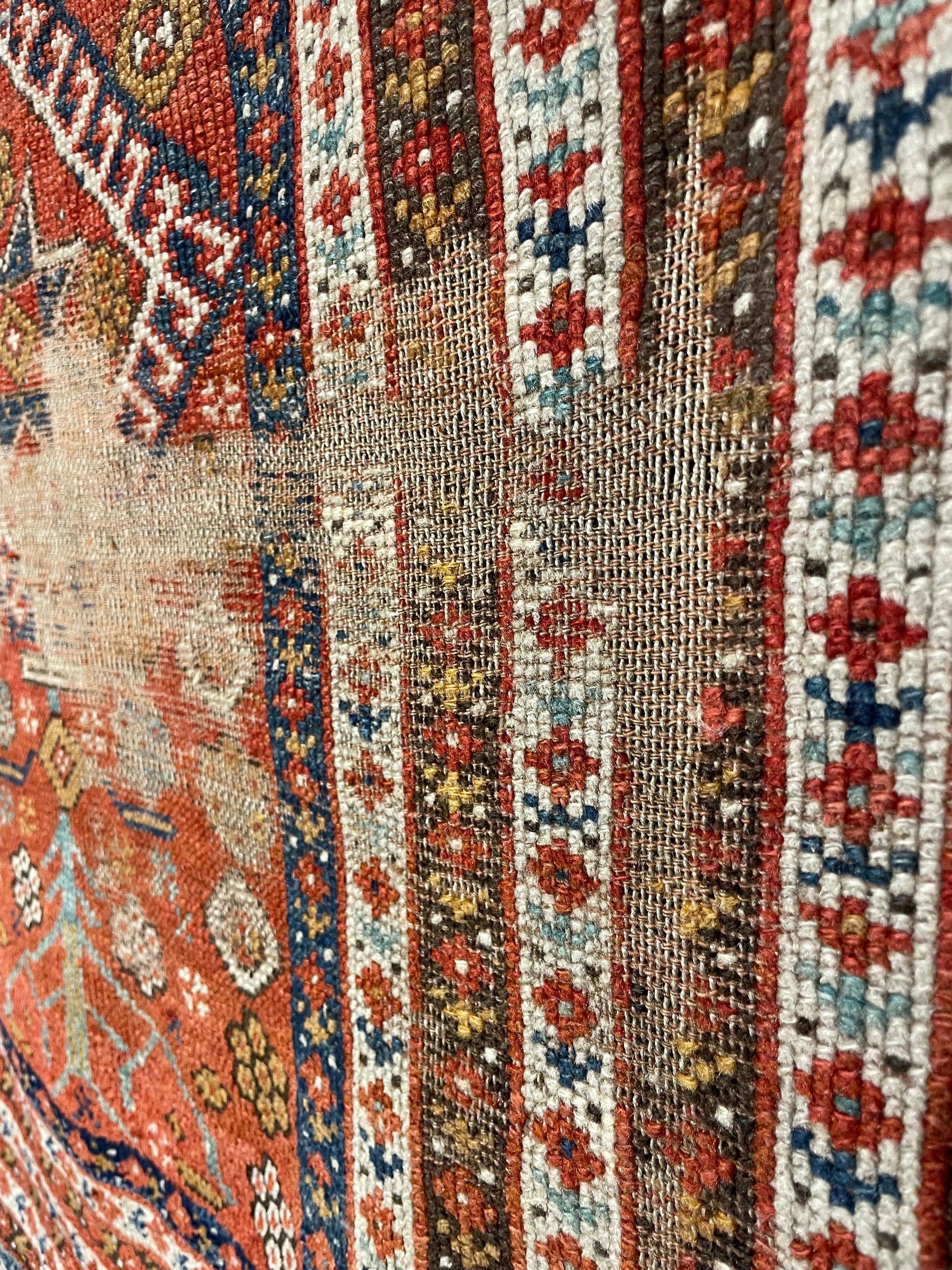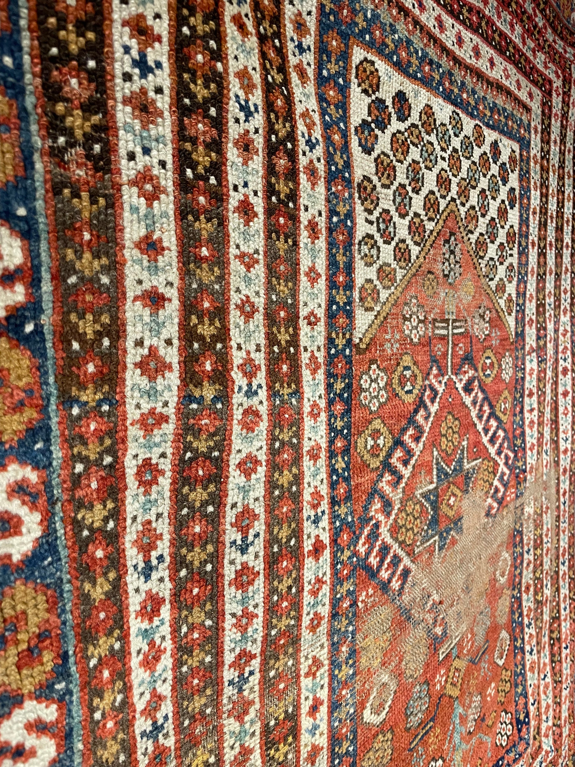 This early Antique Kozak rug originates from the Bergama region of western Turkey. The outer frame is made up of small hooks, used for protection against the evil eye, whilst the intricate daisy chains on next six borders alternate from brown to chalk-white grounds. This leaves a very narrow prayer niche in the field, that is anchored around a Lezghi star, and surrounded by plants and rosettes. Despite the significant wear in the centre, there is no doubt that this Kozak's tidy composition makes it a great decorative rug or wall display.