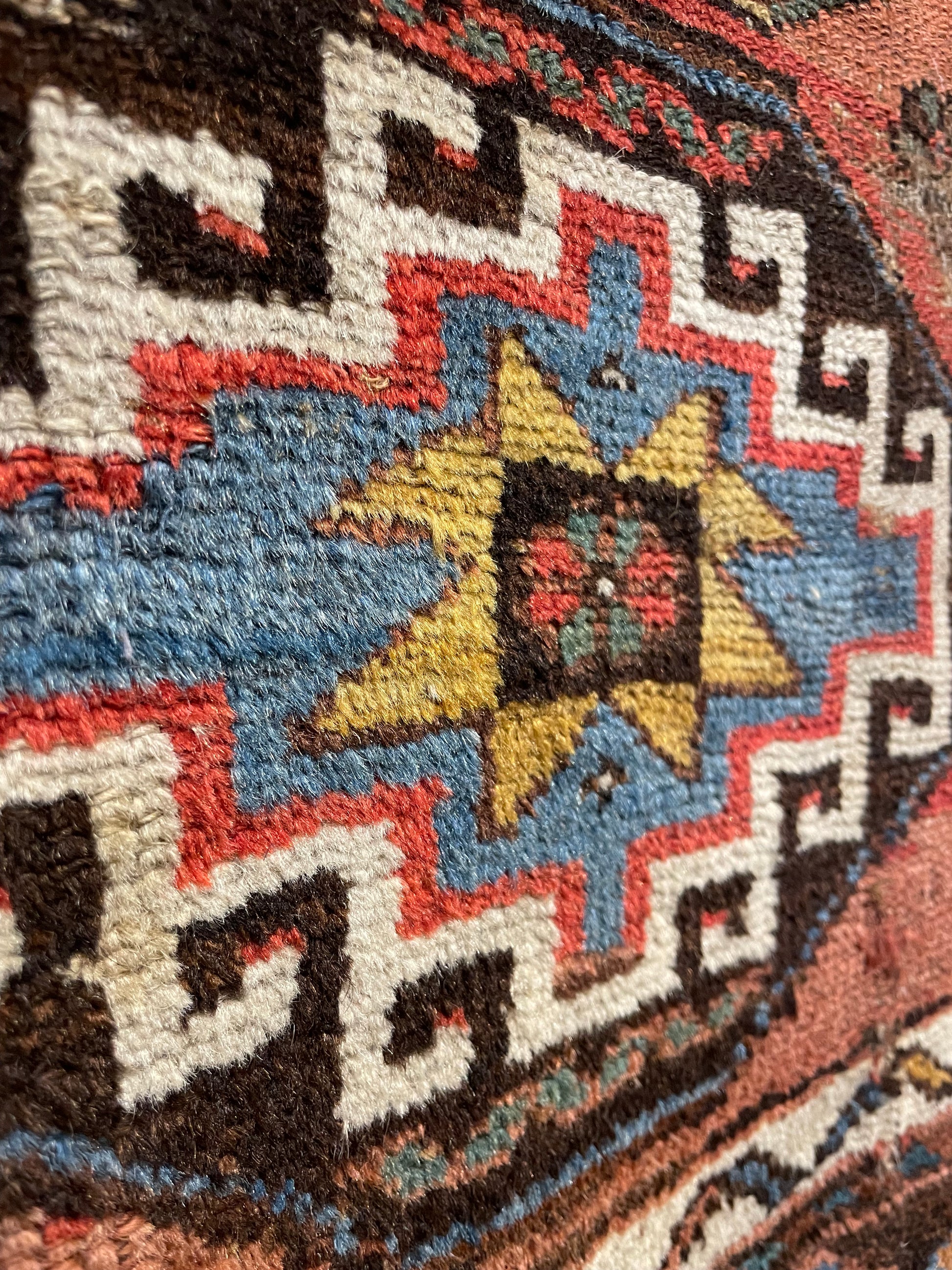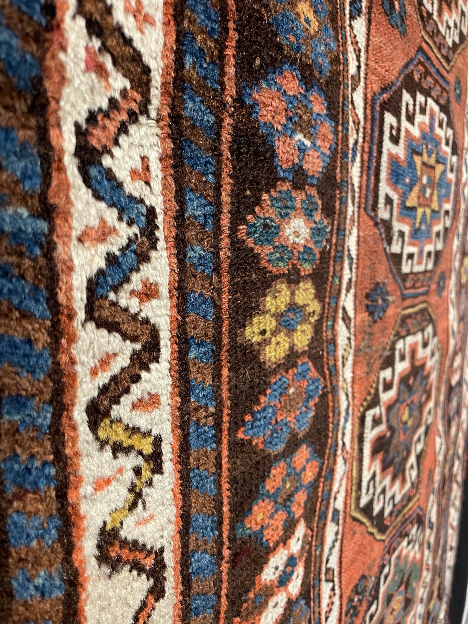 This charming Kurdish rug is made up of many traditional elements. For example, the colourful 'running water' motif along the ivory ground borders frame the rug in a playful way, as if they were the wrapping paper of a gift. The six medallions that line the central field are known as 'Memling Guls,' and these too use a range of colours, from pale forest greens to striking sky blues. Therefore, despite being geometrical in its layout, much experimentation was done through the colour choices, in order to bring this cheerful village rug to life.