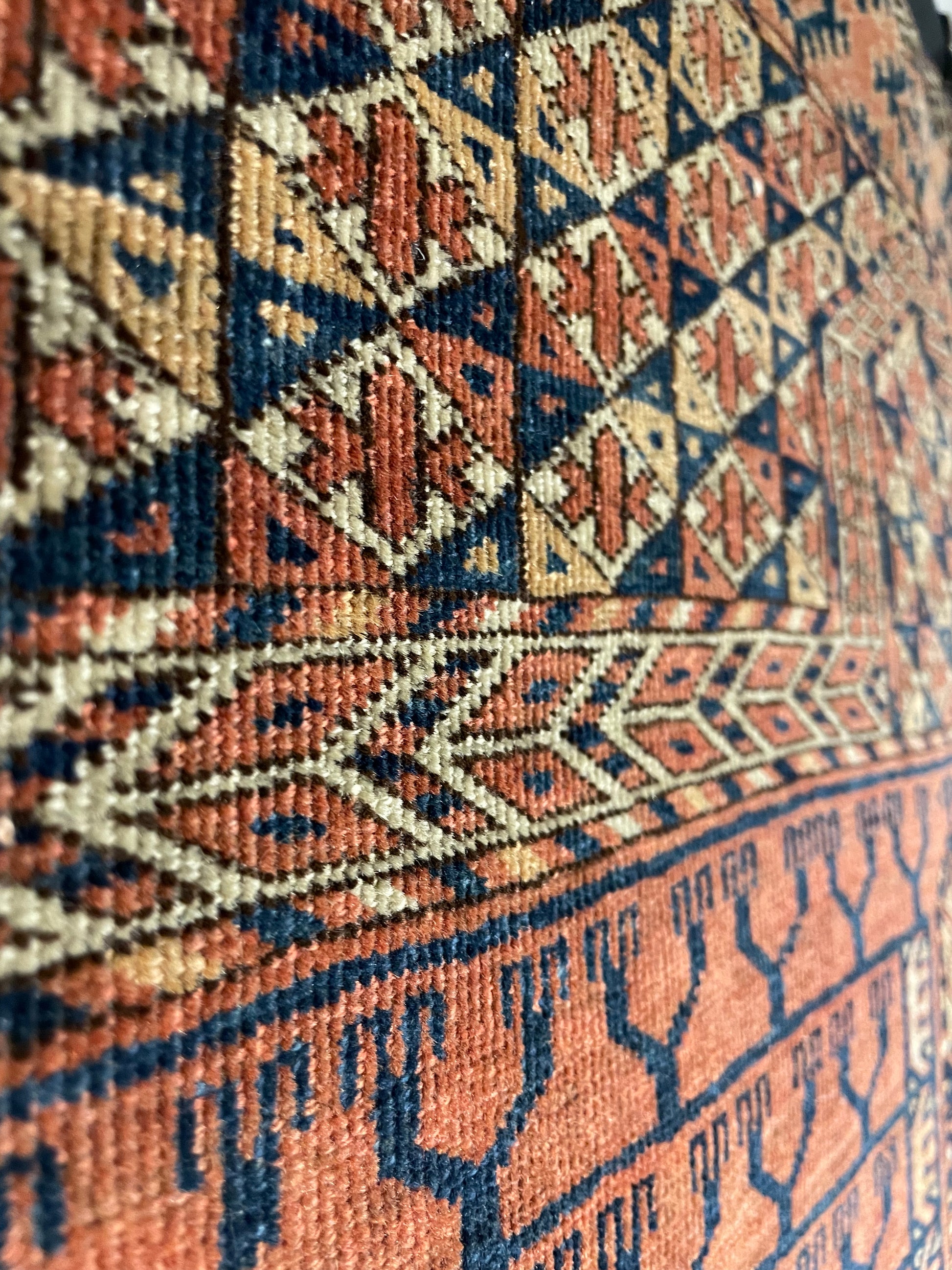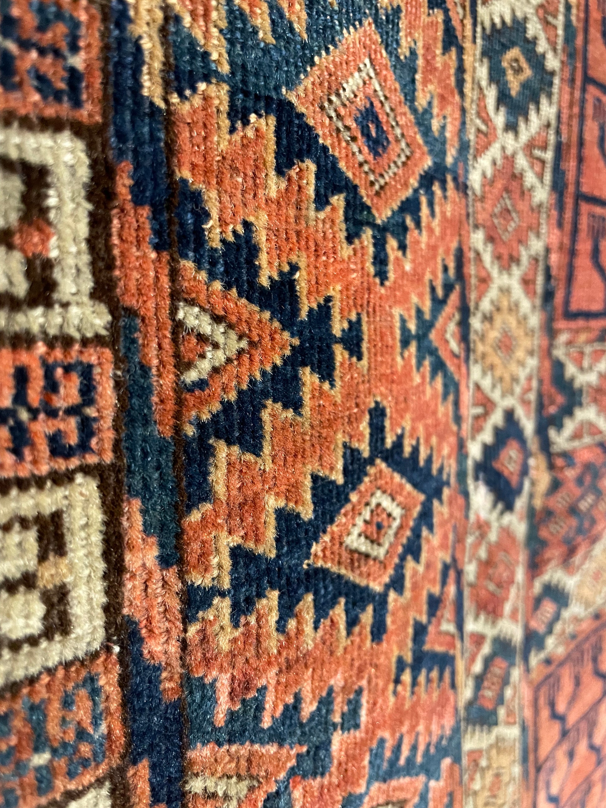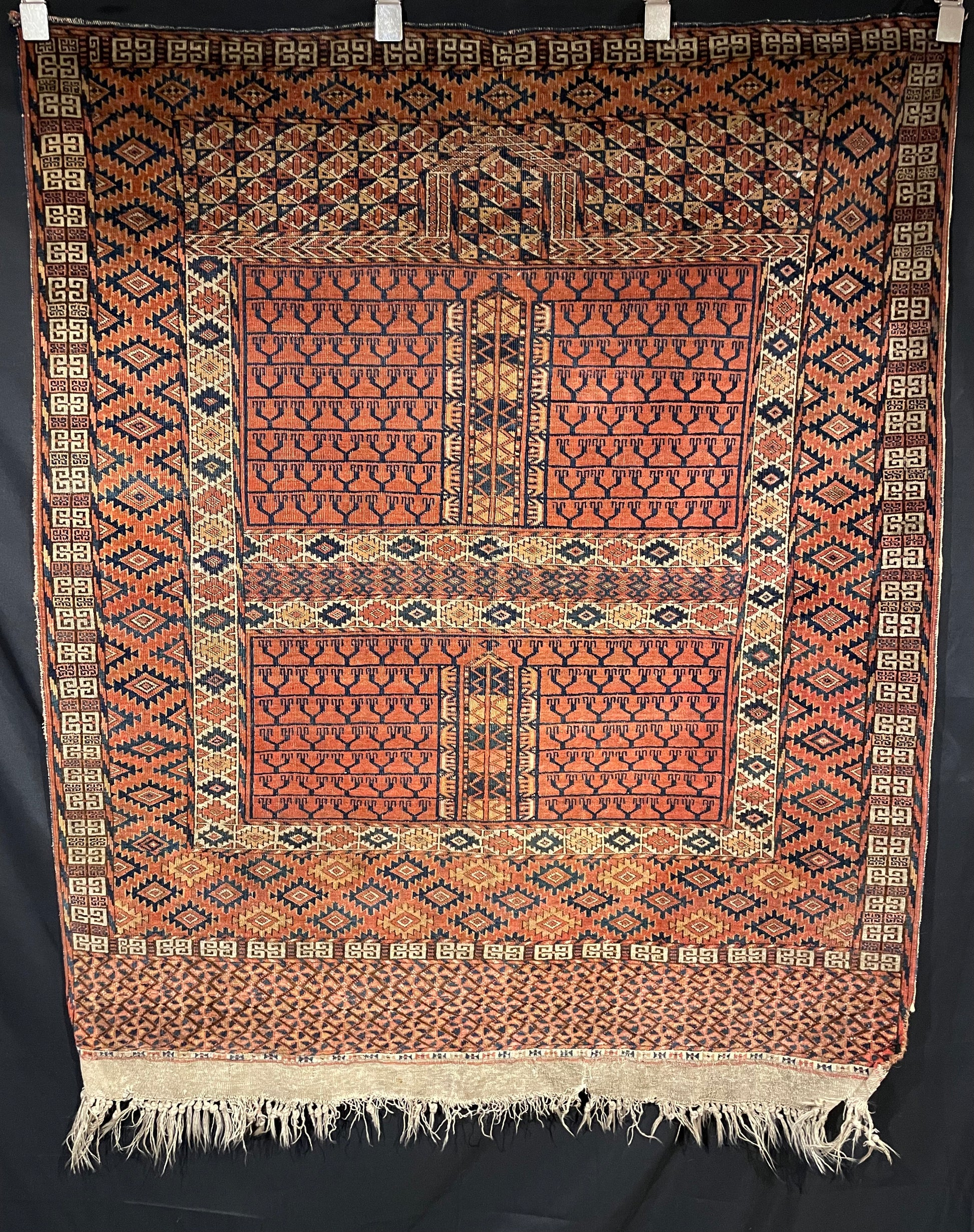 This rug boasts an array of intruiging imagery. A traditional well known rug from this central asian region. The main field is sectioned off into four sections, which may represent the windows to paradise, whilst the addition of the semi-circular niche makes the structure look like a tent. Whatever the intention of the artisan was, the practical importance of these pieces cannot be understated, as they would have originally been used as a door hanging for a Yurt.