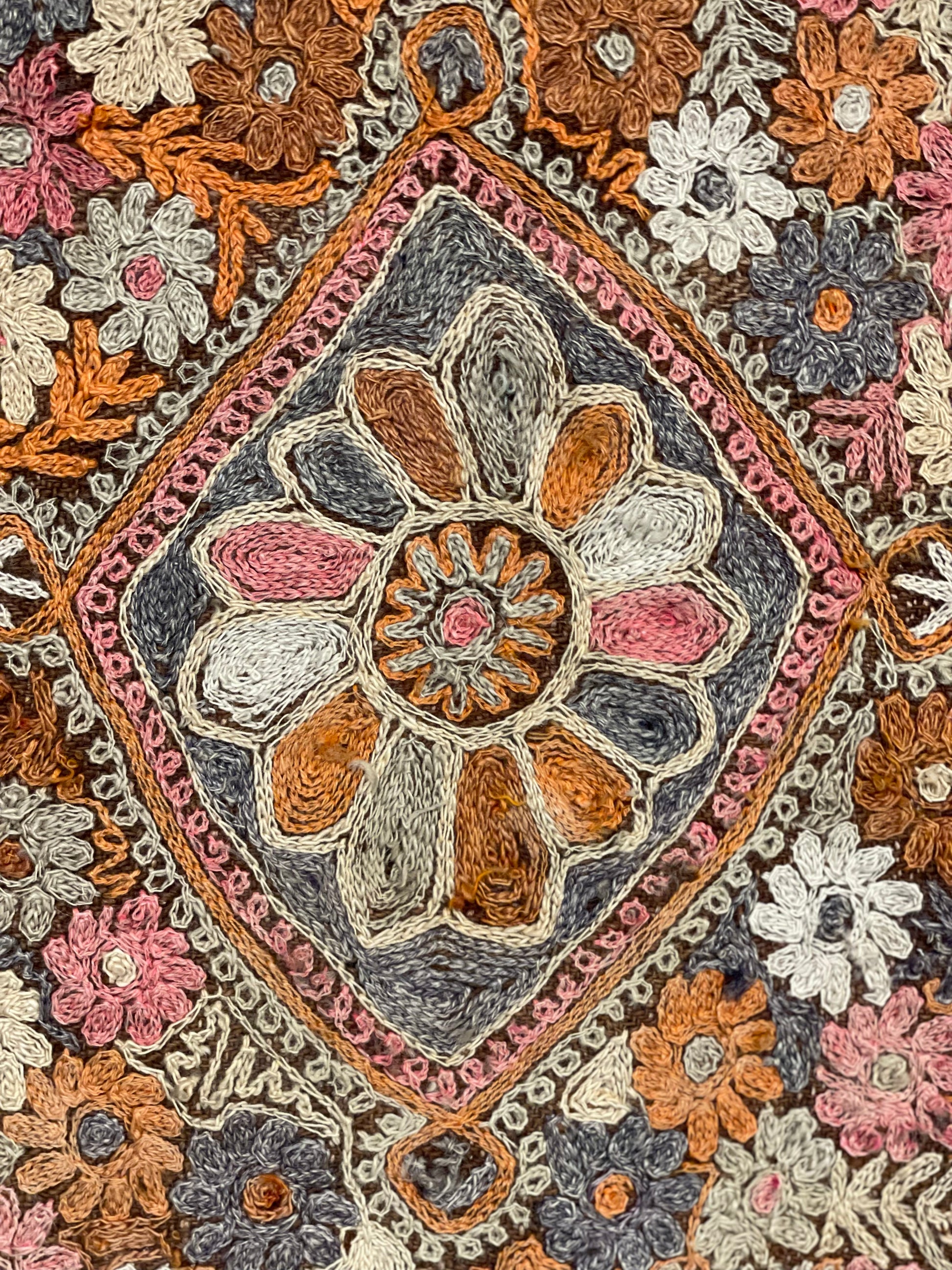 This gorgeous textile is a wonderful expression of Marsh Arab Art. These people have lived on the floodplains of the Tigris and Euphrates for centuries, a unique homeland that is reflected in this blanket through the abundance of colour thats softened over time. This ranges from delicate leaves and flower heads to sprawling vines, made all the more prominent through the soft illumination of the pastel orange foundation. All of these hand-drawn features were traditionally woven by a young woman in preparation for her marriage, giving this wedding blanket a level of emotional value that extends far beyond its physical dimensions.