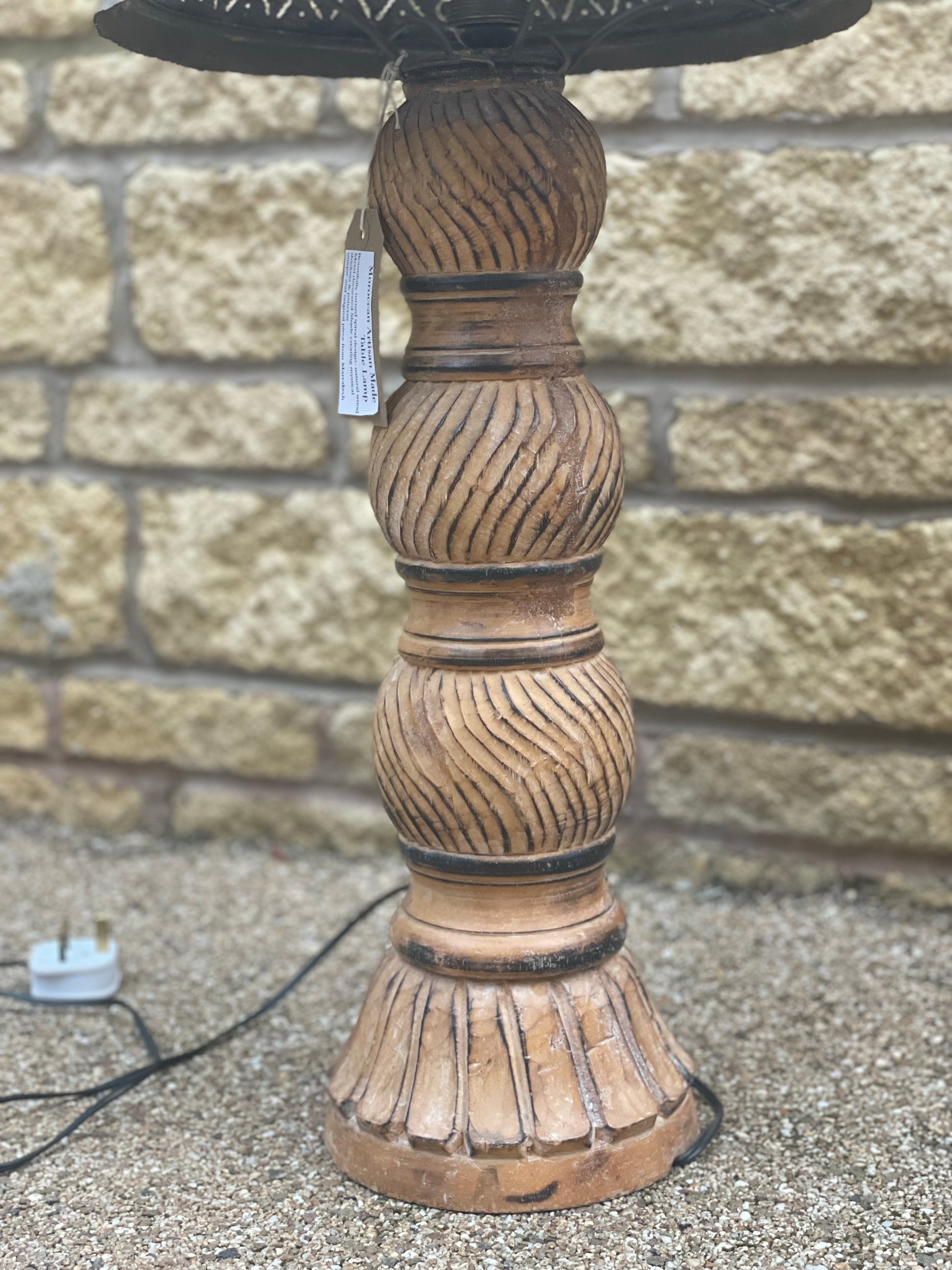 There is no doubt that this Moroccan lamp has a subtle artisanal charm. An array of swirly grooves have been carved onto the wood to create a fluted base, a style that was originally used by the Greeks and Romans to add elegance and texture to their columns. The metal shade completes the lamp with several indentations of flowers and stars, which become illuminated in a warm yellow as the light glistens through. These simple techniques combine to create a beautiful table lamp that outshines any machine-made reproductions.