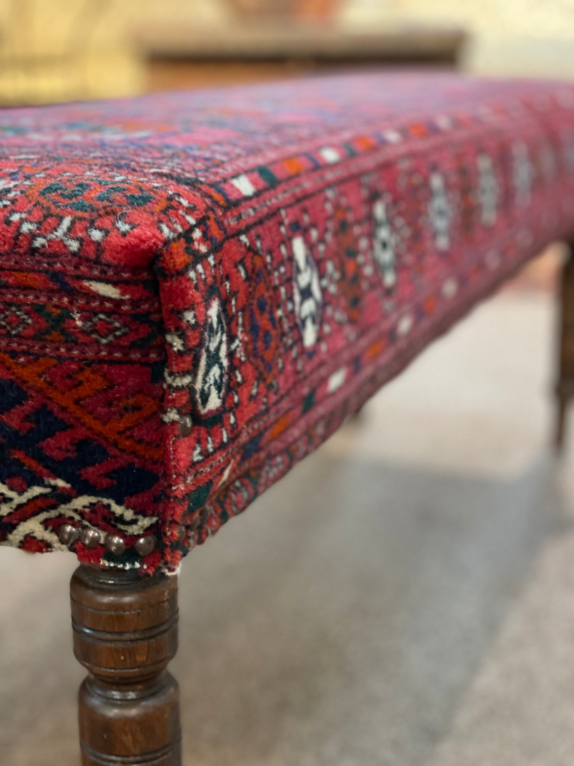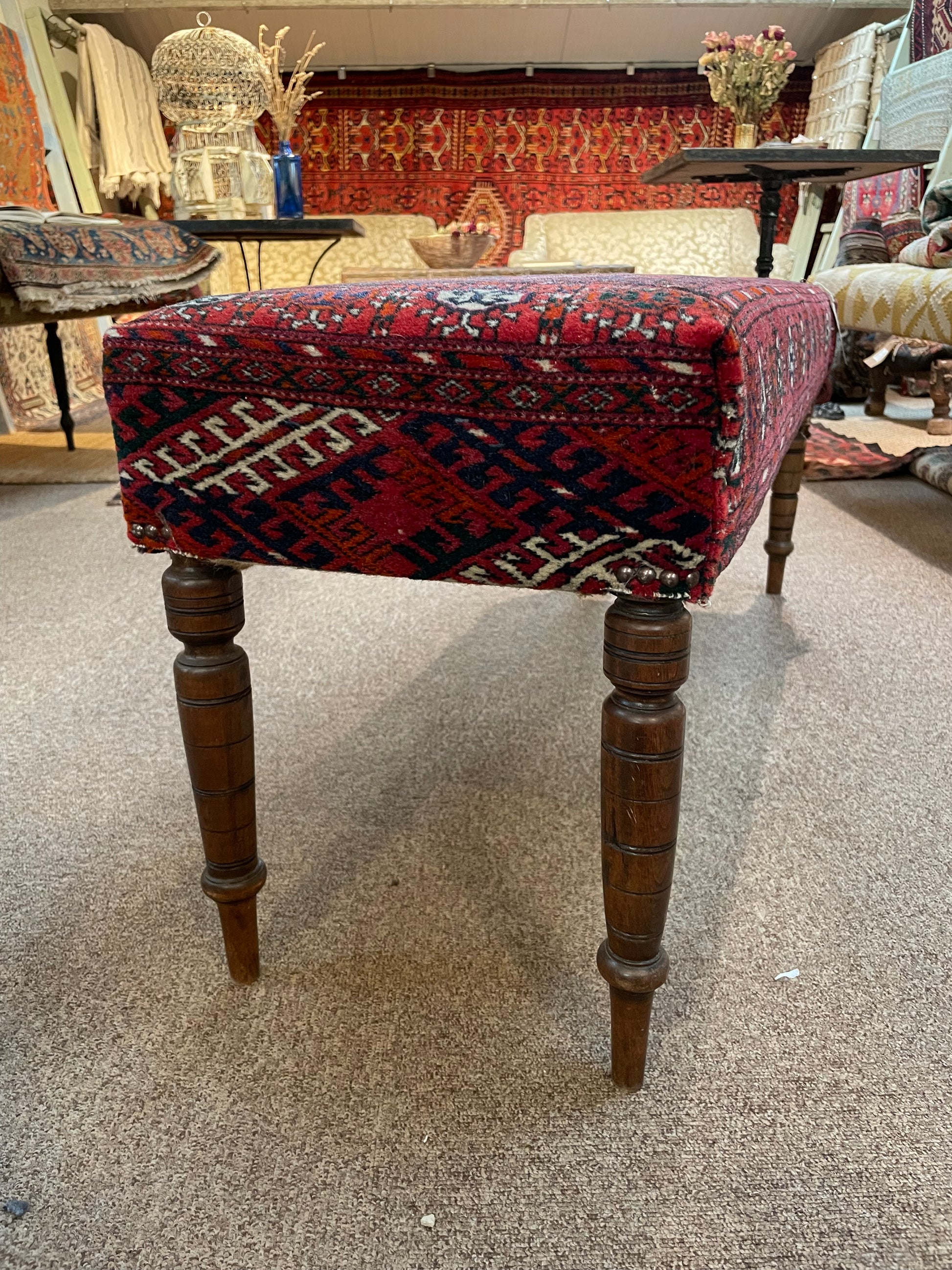 The design of the Ottoman stool gives it an old world charm. Each one of the antique-turned legs display graceful curves along with a tapered finish, whilst the Tekke rug on the seating frame has a tight and seamless appearance. Motifs here include variations of the ram horn pattern and a couple of checkered borders that run along the regal red ground. These details are brought to life by touches of blue and pearly white, creating a stool that showcases a rich tonal harmony.