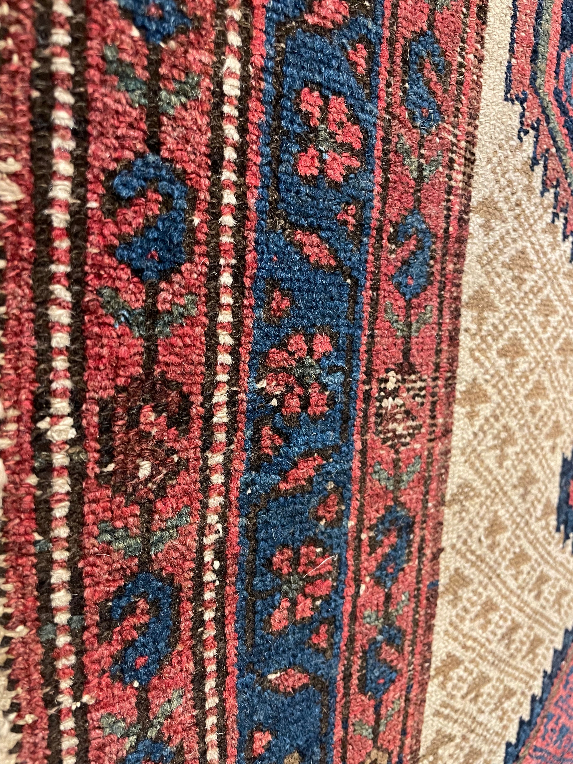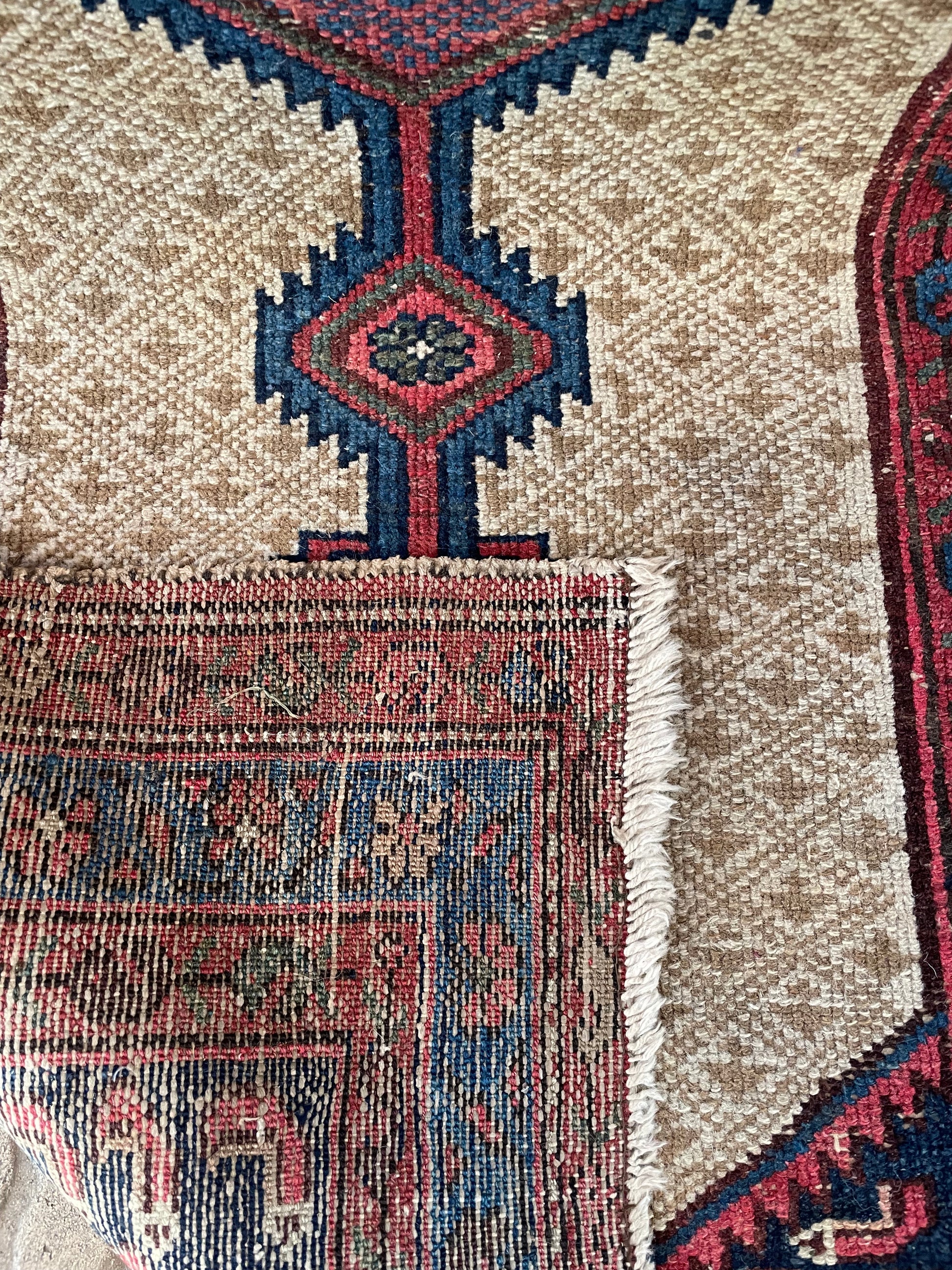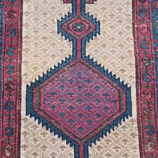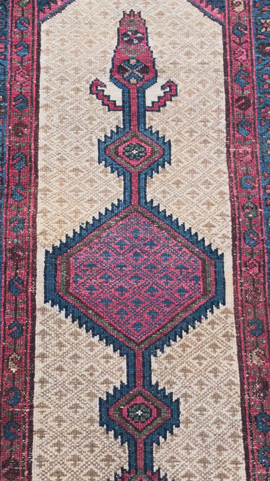 This Hamadan Runner exudes Persian charm. One of the most striking features is the rich colour scheme, especially the golden ivory field, that immediately draws the attention to the central 'King's staff' design. Despite being made over 100 years ago, the surrounding panels of royal red and midnight blue retain their sparkle, adding to the timeless sense of prestige and luxury. Due to it's dimensions, this rug would fit best in a hallway.
