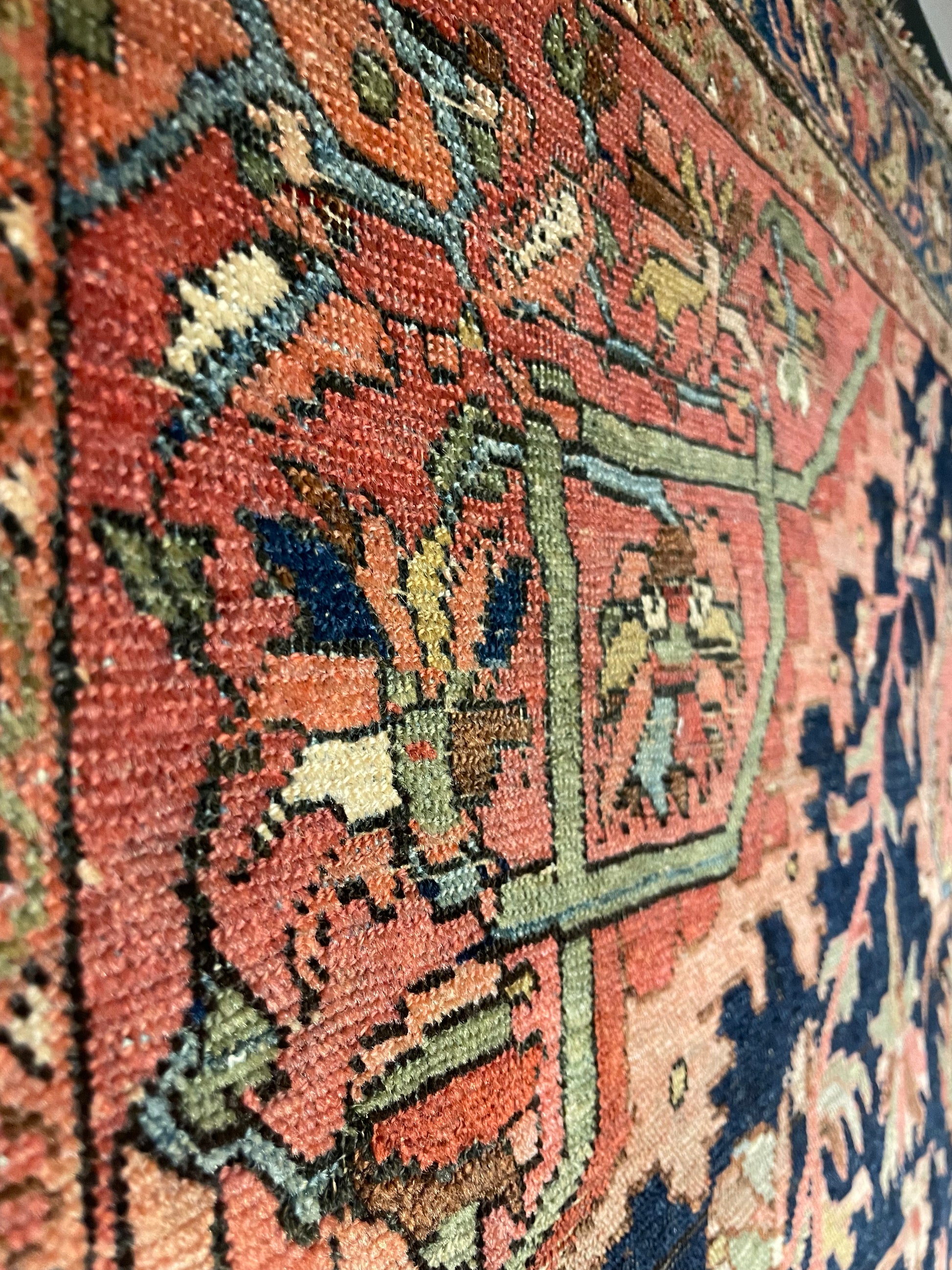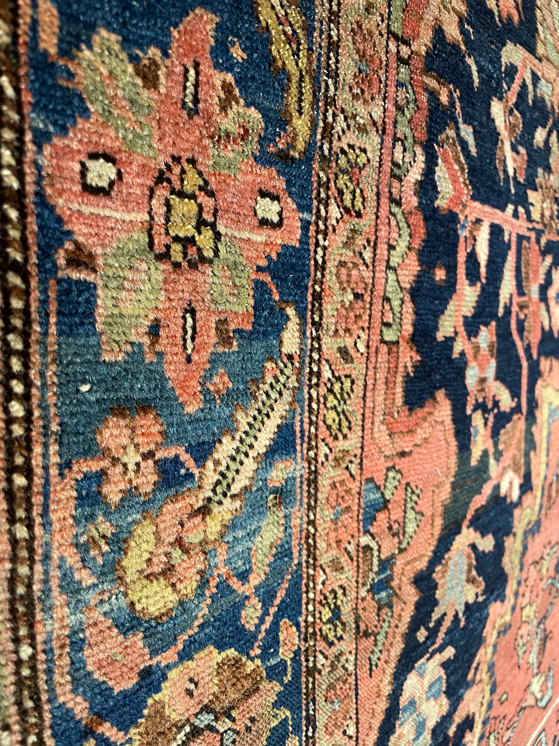 This rug has a well known traditional design that originates from the region of Arak. Despite displaying so many intricate features, it is the large Jewel-shaped medallion in the centre that first captures the attention. Its naive design suggests it was made in a village of this region, and its this very thing that gives it its sublime character. surrounded by a dark indigo shadow that appears to be a silhouette, indicative of a Persian night sky, whist the sheer abundance of leaves, flower heads and interconnected vines make it easy to get lost in this remarkable scene with a gorgeous saturated colour palette. It shows various signs of abrash and other imperfections, but this only adds to its presence.