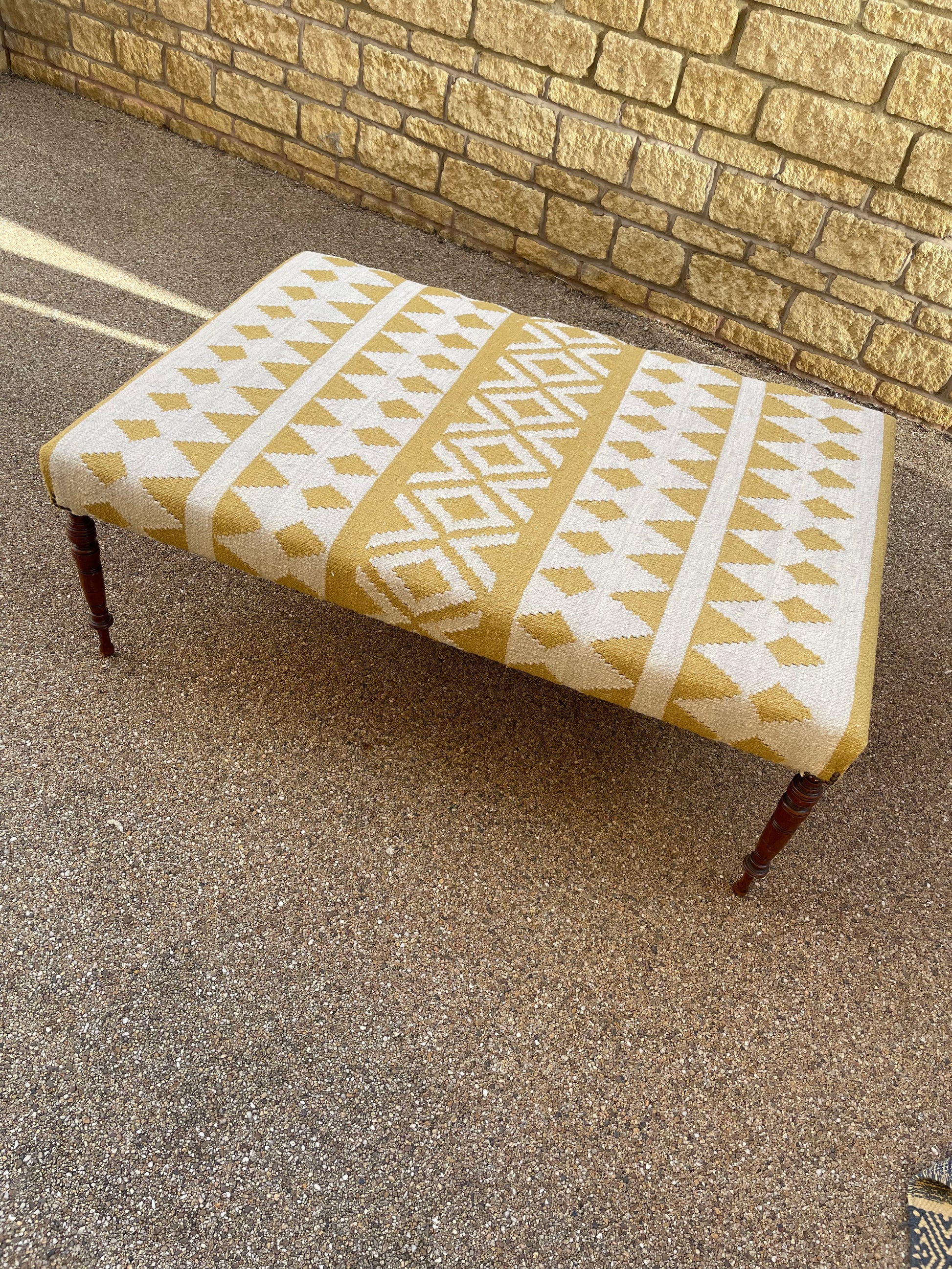 This stool has a beautiful blend of classic and contemporary styles. The four antique-turned legs are handcrafted from wood, giving each a rustic brown appearance that evokes the charm and durability of quality antique furniture. The seat is upholstered with a handwoven kilim, with geometric rows of diamonds and arrow-heads that are adorned in sweet, saffron hues.