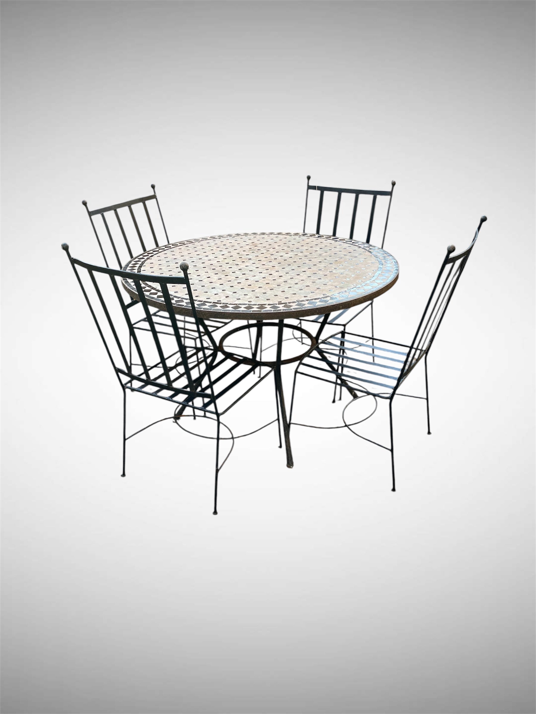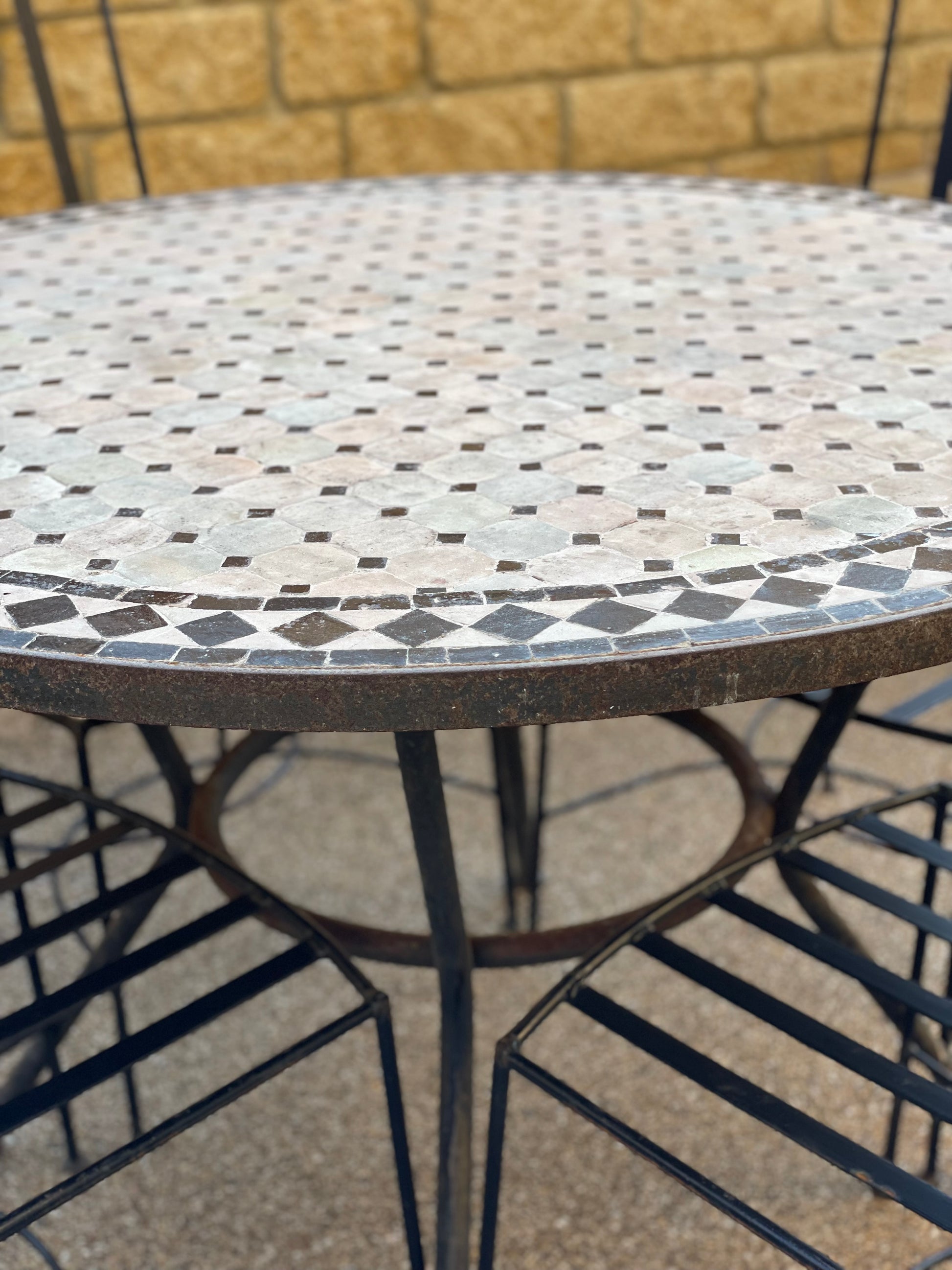 Vintage Moroccan Mosaic table & chairs set features a handcrafted round removable mosaic table top and iron chairs. The table's centrepiece is a zellige tile top with black & ivory tiles, which uses traditional geometric mosaic techniques. Rustic in age and design.