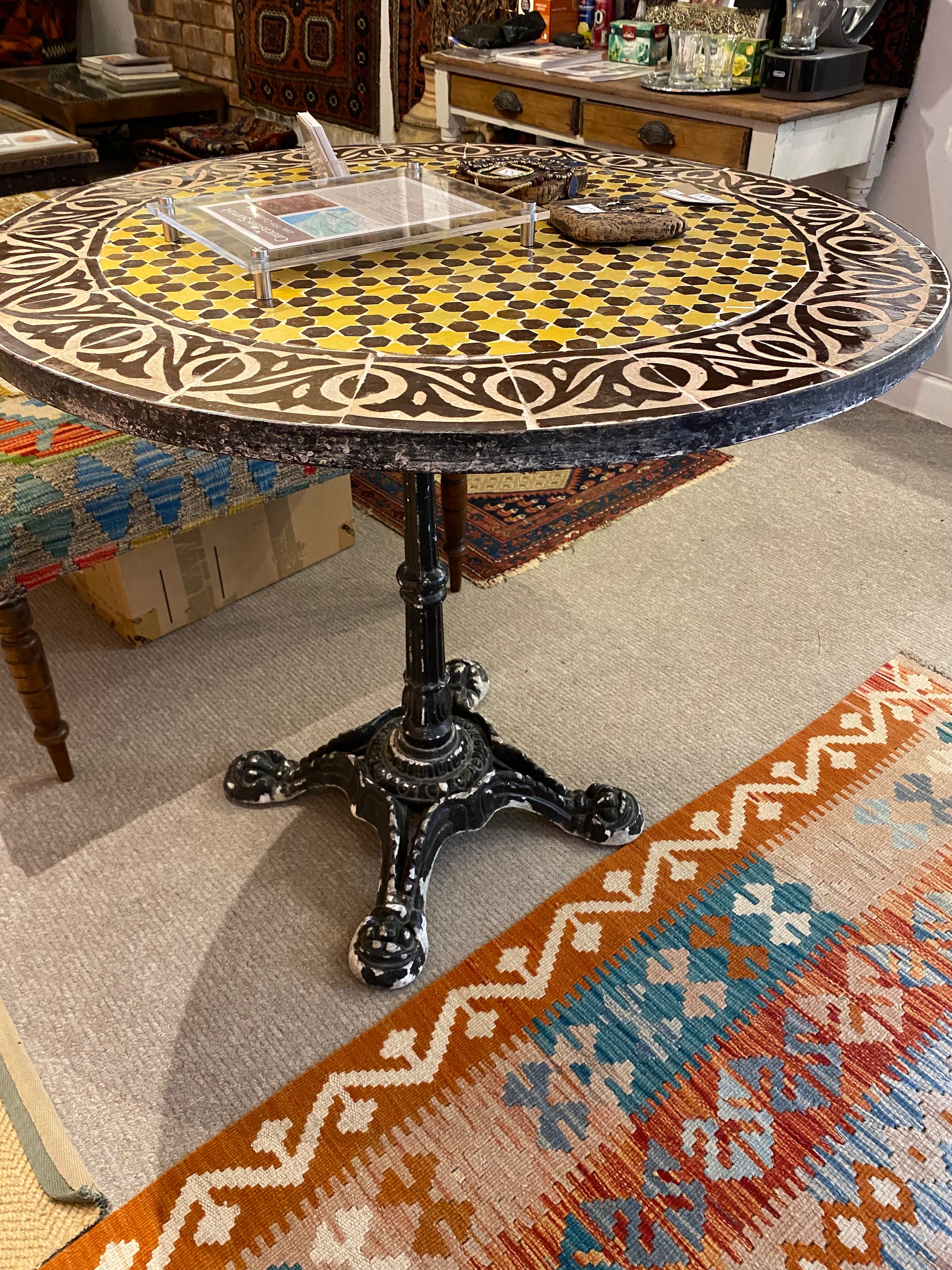 This table has great artistic flair in its mosaic design. Interconnected flower heads alternate in direction through the rhythmic and well-executed design along the border, whilst the dark hexagonal tiles on the checkerboard centre contrast against the yellow stars in order to capture the attention. Although the base shows signs of decay, it has a rustic and desirable look that further adds character to this vintage garden table.